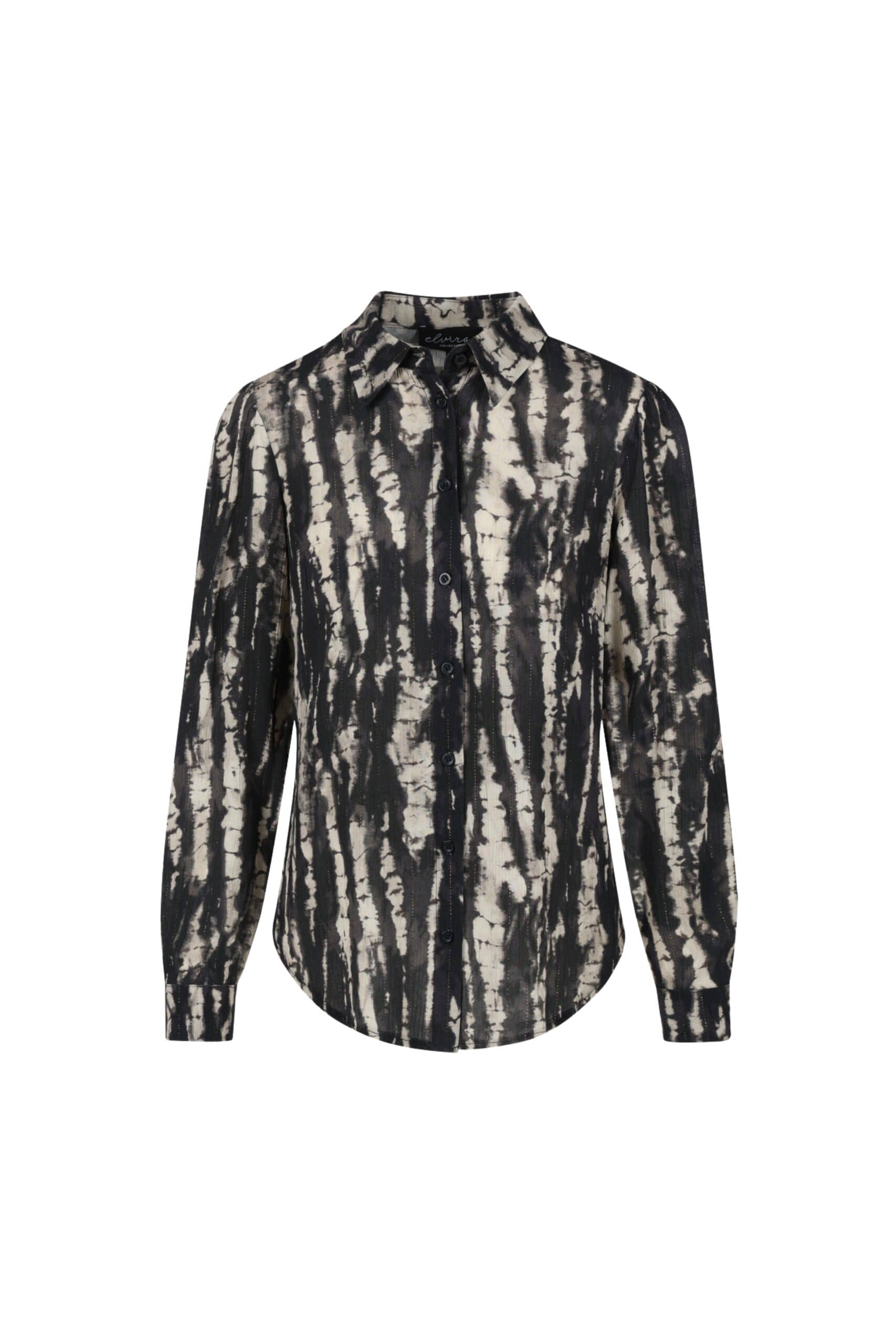 De Blouse Loes van Elvira is een elegante blouse met lange mouwen en een klassieke kraag. De blouse is uitgevoerd in een all-over dessin met een subtiele glitterdraad (lurex) erin verwerkt, wat zorgt voor een sprankelende finish. De blouse heeft een klassieke knoopsluiting.