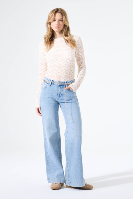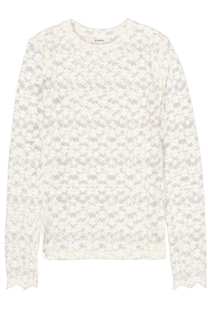 Off White longsleeve met een elegante kantafwerking voor een vrouwelijke, verfijnde uitstraling. De top heeft een ronde hals, lange mouwen en een aansluitende pasvorm, waardoor hij perfect is om zowel solo als onder een blazer te dragen.