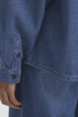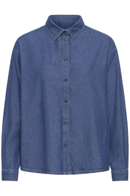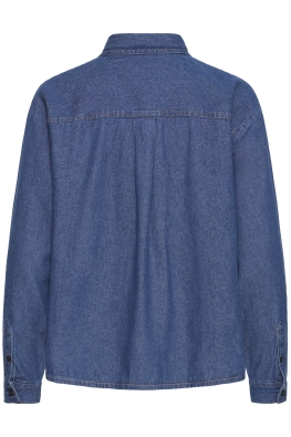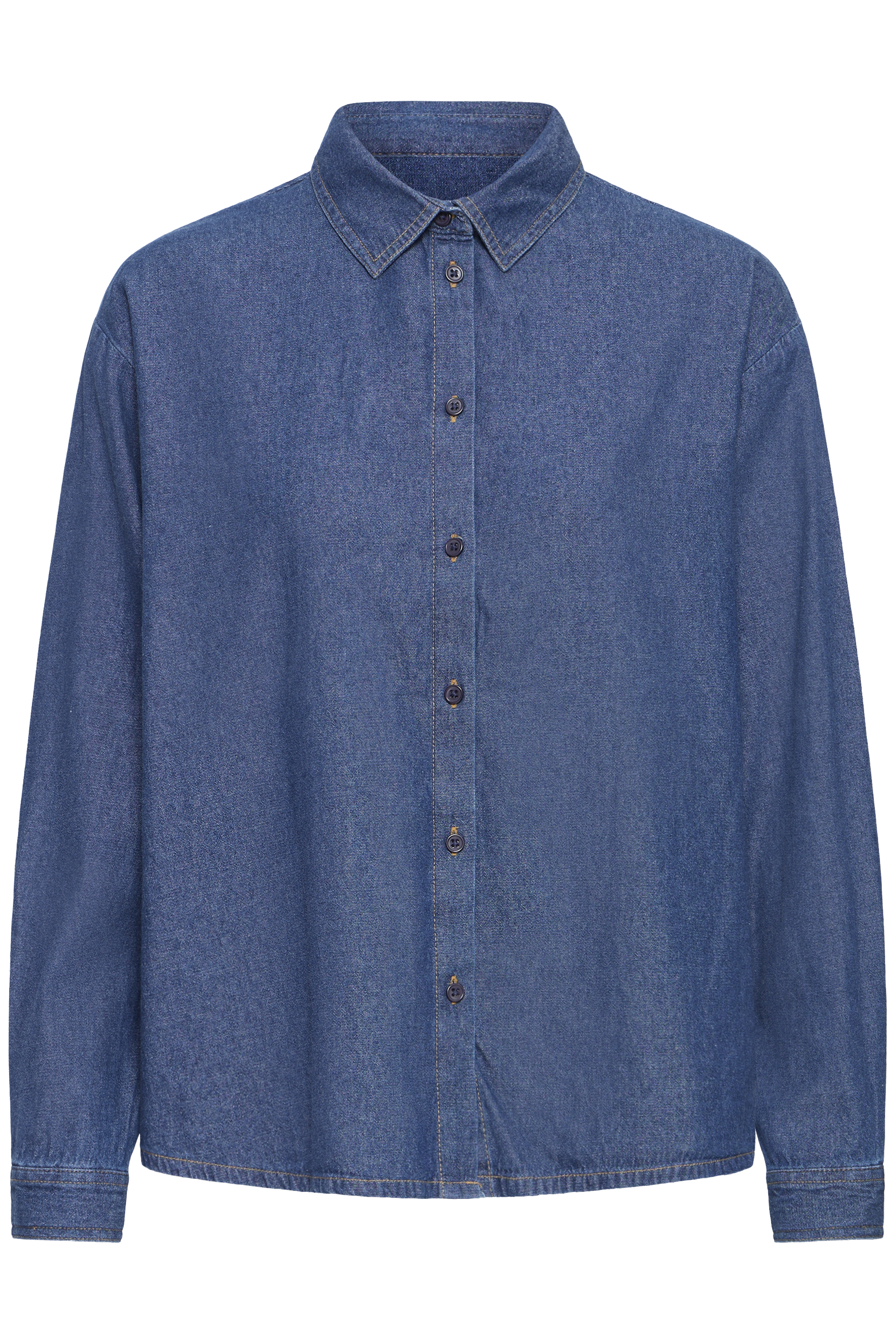 Denim overhemd met rechte pasvorm, klassieke puntkraag en lange mouwen. Voorzien van knoopsluiting, zichtbare stiksels en zacht oppervlak.