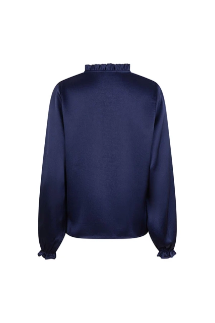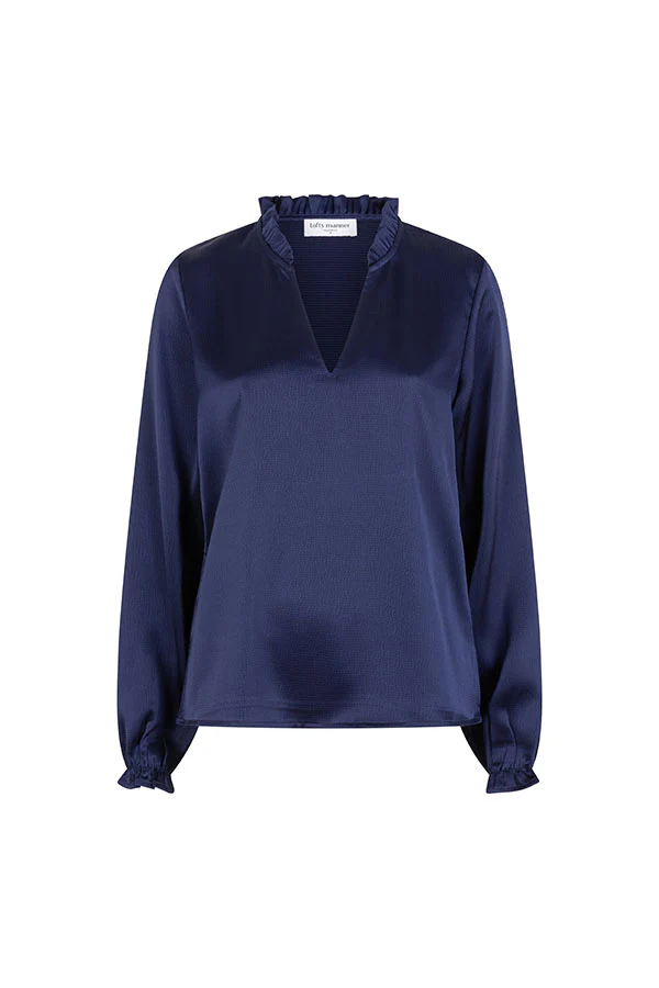 Zoek je een blauwe blouse met ruches? De Blouse Eliza van Lofty Manner is een elegante top met een luxueuze satijnachtige look. Deze blouse heeft een flatterende V-hals en is verfraaid met speelse ruffles langs zowel de kraag als de mouwuiteinden.