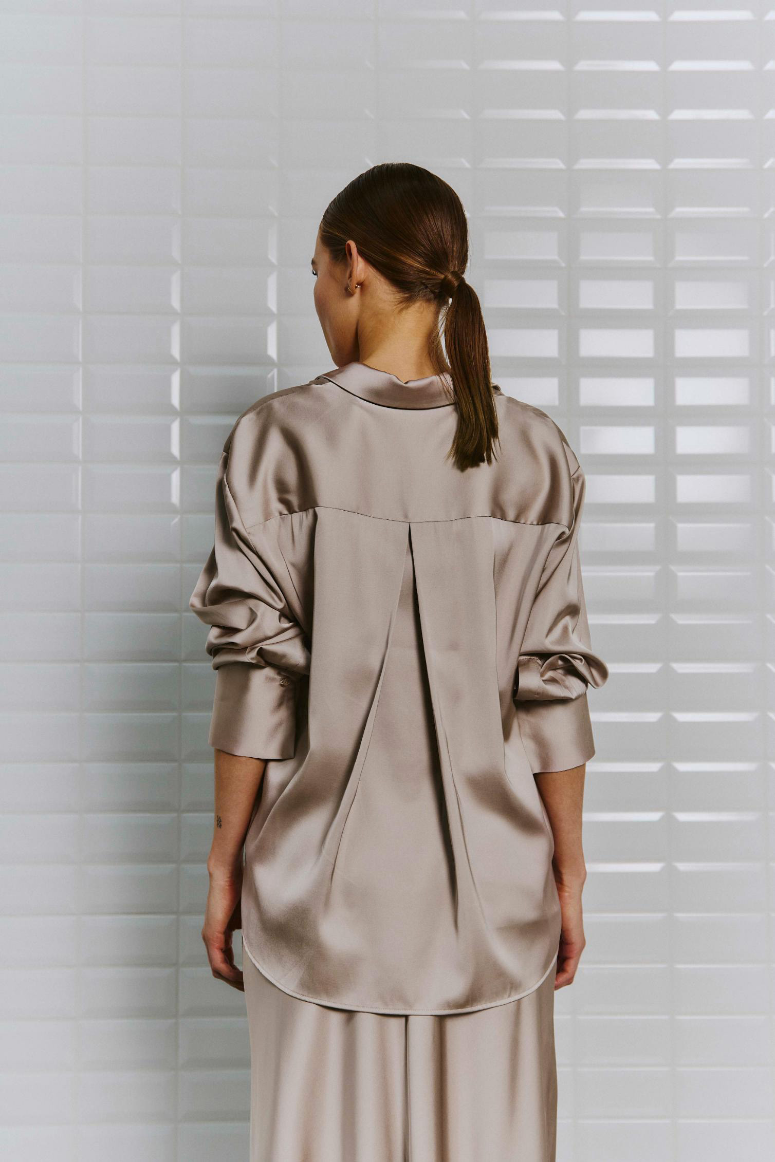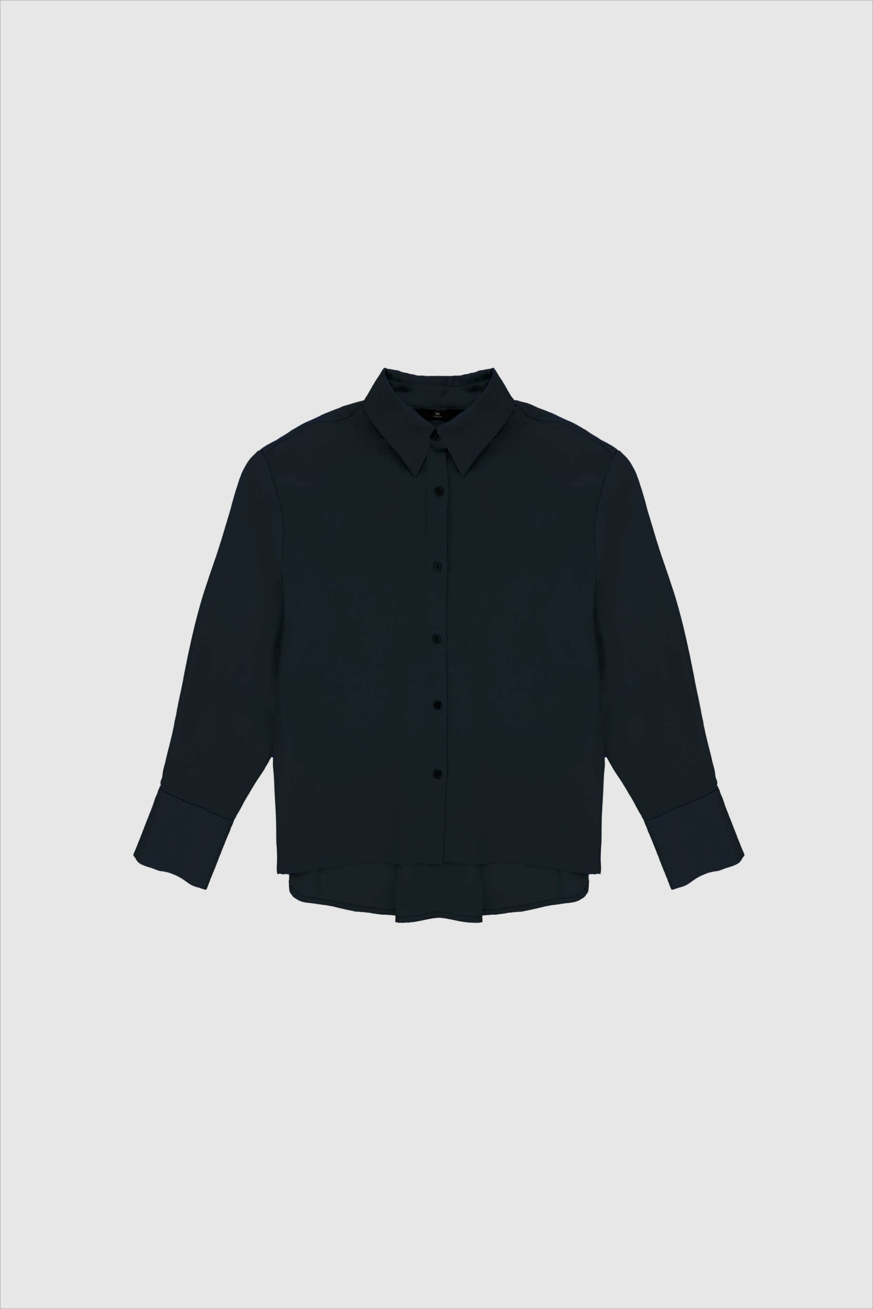 De Dagmar Sateen Blouse is een stijlvolle blouse met een luxe, satijnachtige uitstraling. De blouse heeft een klassieke kraag en opstaande boord en sluit met knoopjes. De normale pasvorm valt tot op de heup en heeft een modieus, afgeronde zoom (curved hemline). De lange mouwen worden afgesloten met een hoge manchet en één knoop, wat zorgt voor een elegante touch.