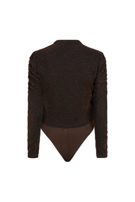 De Body Everly is een aansluitende stringbody met een vrouwelijke V-hals en een elegant wrapdetail. De body is voorzien van subtiele pofmouwen en een knoopsluiting aan de onderzijde. Dankzij de lurex details heeft de stof een luxe glinstering. De body bevat veel stretch en zorgt voor een perfecte pasvorm.