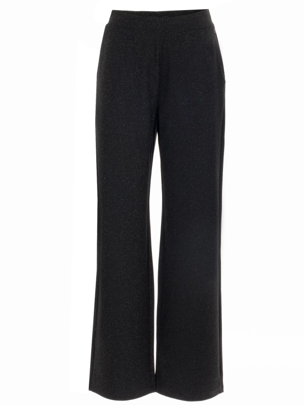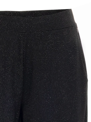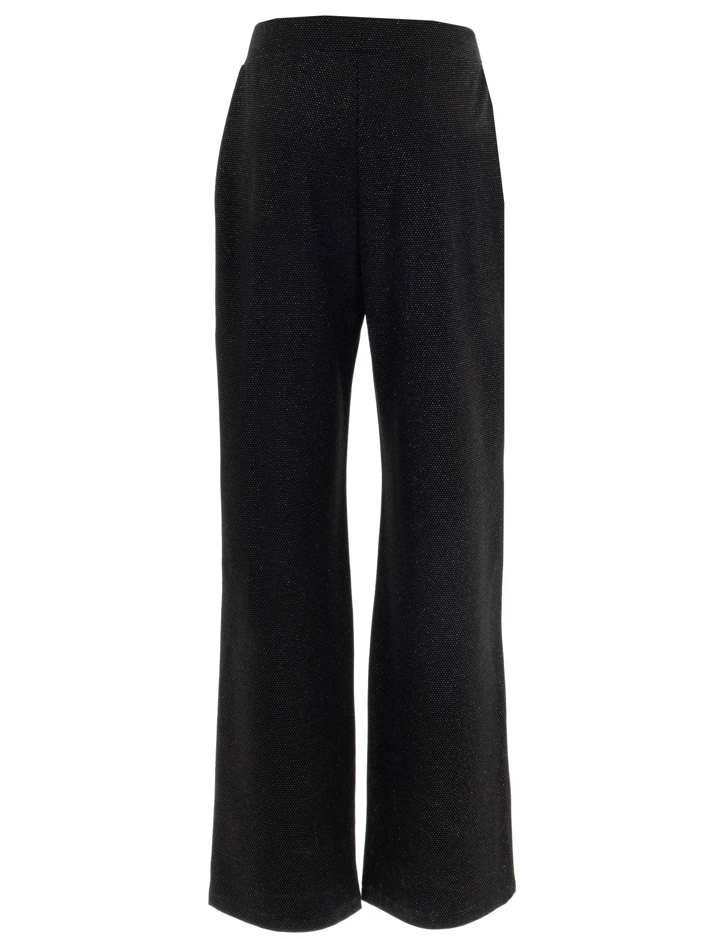 De Broek Julia van Elvira is een comfortabele zwarte broek met een rechte pasvorm en wijde pijpen. De stof bevat een subtiele glitter en een structuur die zorgt voor een luxe uitstraling. Met een elastische tailleband voor draagcomfort en de lengte tot over de enkel is dit een veelzijdige broek, ideaal voor zowel nette als casual looks. Draag hem met de bijpassende top als co-ord set met een mooie zwarte blazer voor een complete look!