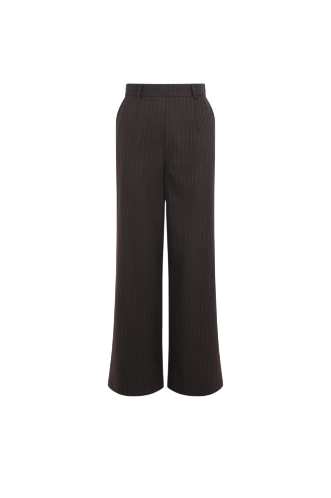 De Broek Madde van Elvira is een stijlvolle broek met een klassiek krijtstreepdessin. De broek heeft wijde pijpen en is uitgerust met praktische steekzakken en een comfortabele elastische tailleband. Deze broek vormt een perfect pak met de bijpassende Blazer Madde.