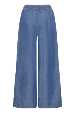 Deze denim broek heeft een wijde pijp, hoge elastische taille met aantrekkoord en nonchalante pasvorm, afgewerkt met subtiele stiksels.