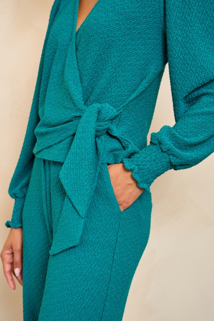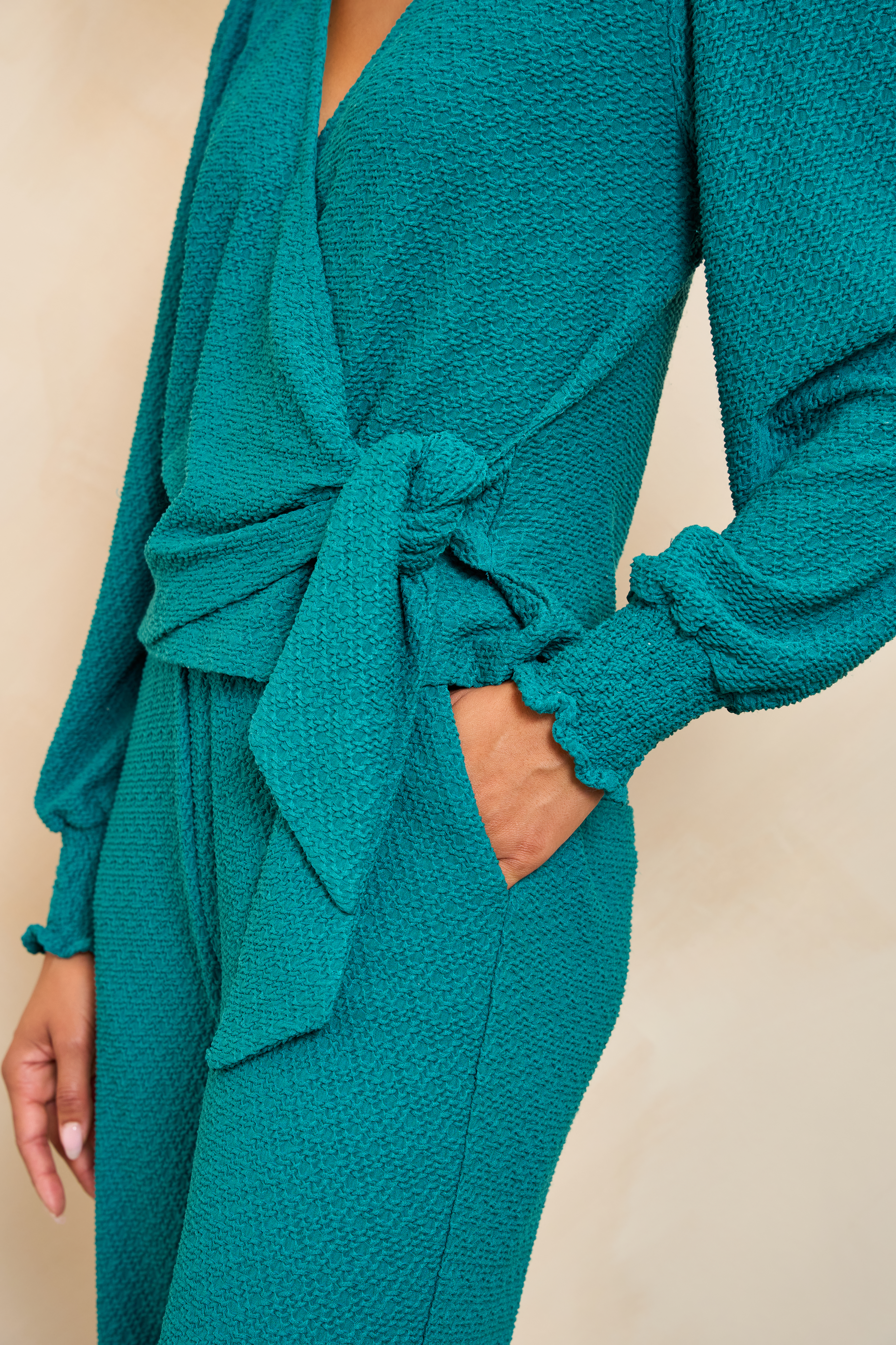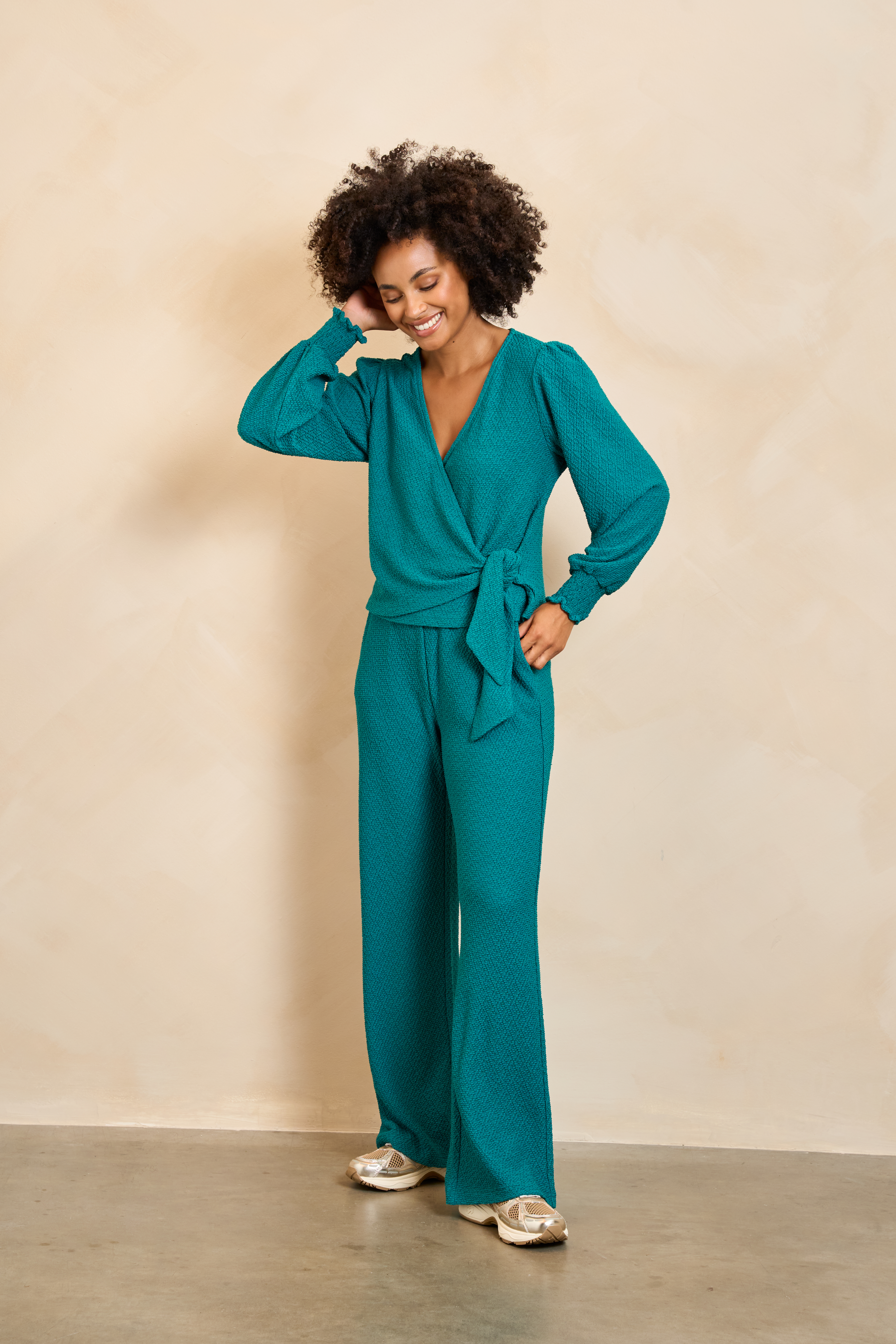 Broek Amaris is een teal broek met elastische tailleband en rechte pijpen. De stof bevat stretch voor extra comfort. De broek valt relaxed. Een veelzijdige broek die makkelijk te combineren is met tops en sweaters.