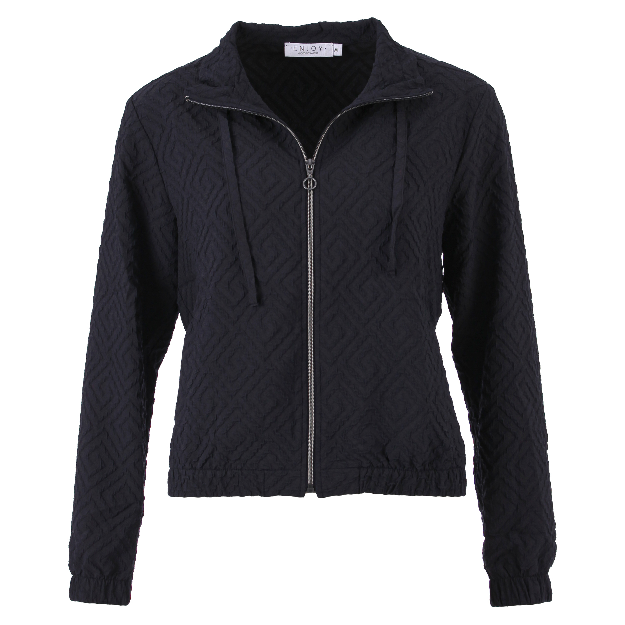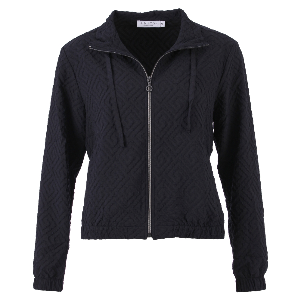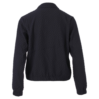 Indigokleurig jacquard jasje met een stijlvolle, luxe uitstraling. Het jasje is gemaakt van een soepele kwaliteit met lichte stretch, waardoor het comfortabel draagt en mooi in vorm blijft. Perfect om een outfit net dat extra detail te geven.
