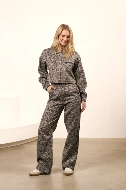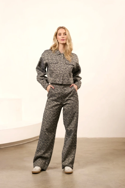 De Jacket Eleanor van Lofty Manner is een losvallend kort jasje met print, gemaakt van een mooie jacquard stof. Dit jasje heeft een klassieke kraag, een ritssluiting en praktische borstzakken. De elastieken mouwuiteinden zorgen voor een comfortabele en toch stijlvolle finish.