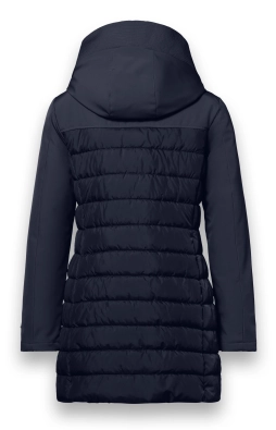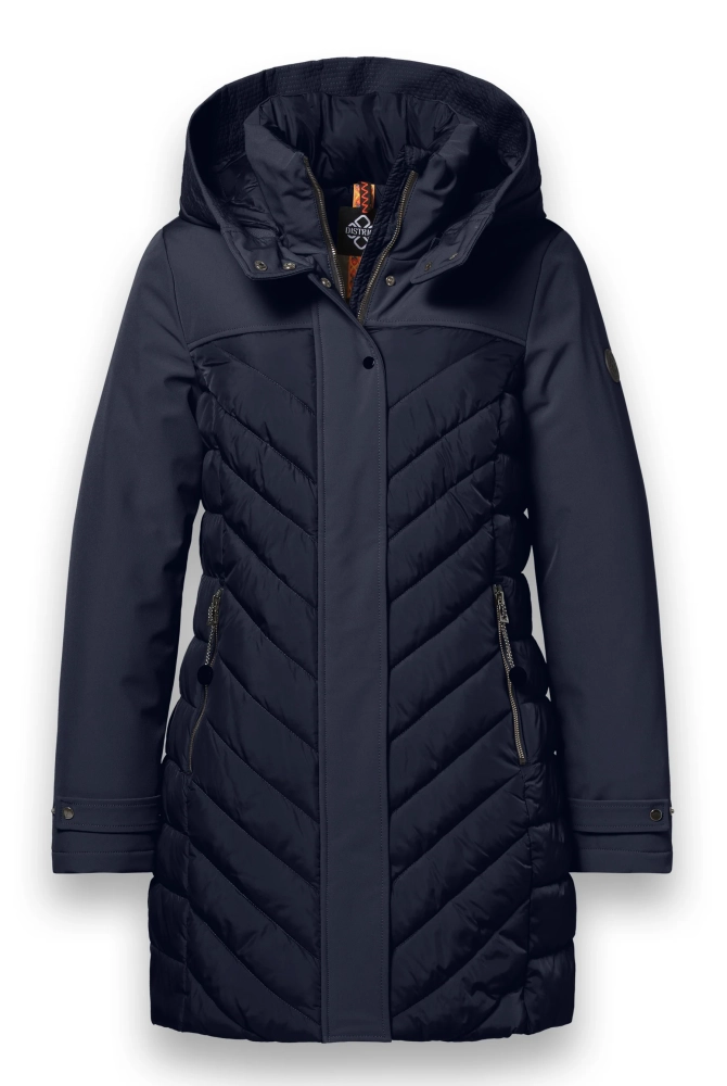 De District St. Moritz jas is een lange jas met een opvallende materiaalmix: een gewatteerde voorzijde gecombineerd met effen mouwen. De jas heeft een ruime, afneembare en verstelbare capuchon en stoere metalen ritsen. De ritssluiting aan de voorkant wordt beschermd door een windvanger met drukknopen. De jas is voorzien van twee ruime steekzakken met rits, verstelbare manchetten met gebreide windvangers en een afsluitbare binnenzak met rits.