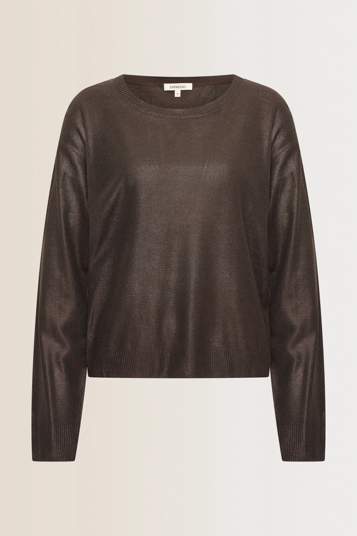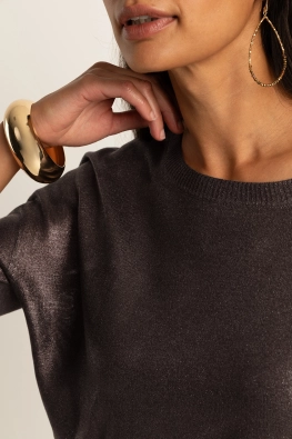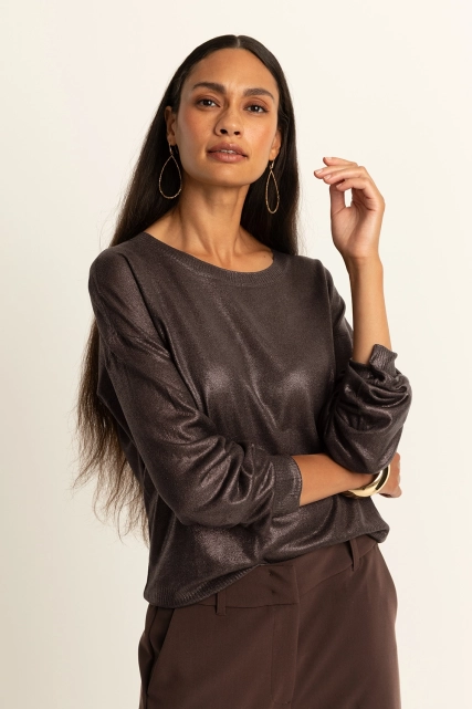 Bruine trui met coating– viscoseblend met subtiele metallic glans. Relaxed fit met ronde hals en lange mouwen. De lichte glans geeft deze trui een feestelijke touch, terwijl de soepele stof zorgt voor ultiem draagcomfort. Een veelzijdige trui die moeiteloos van dag naar avond te stylen is.