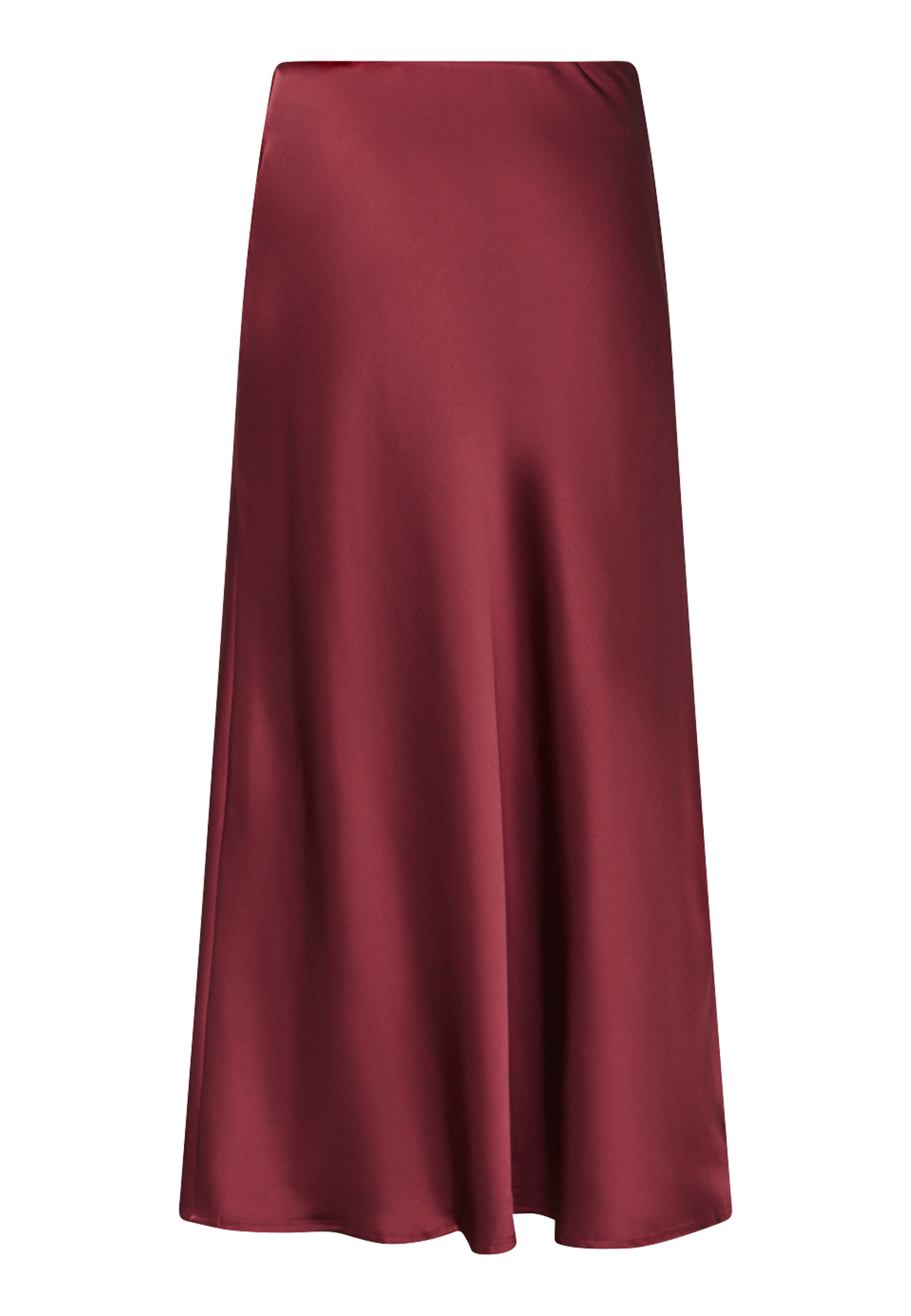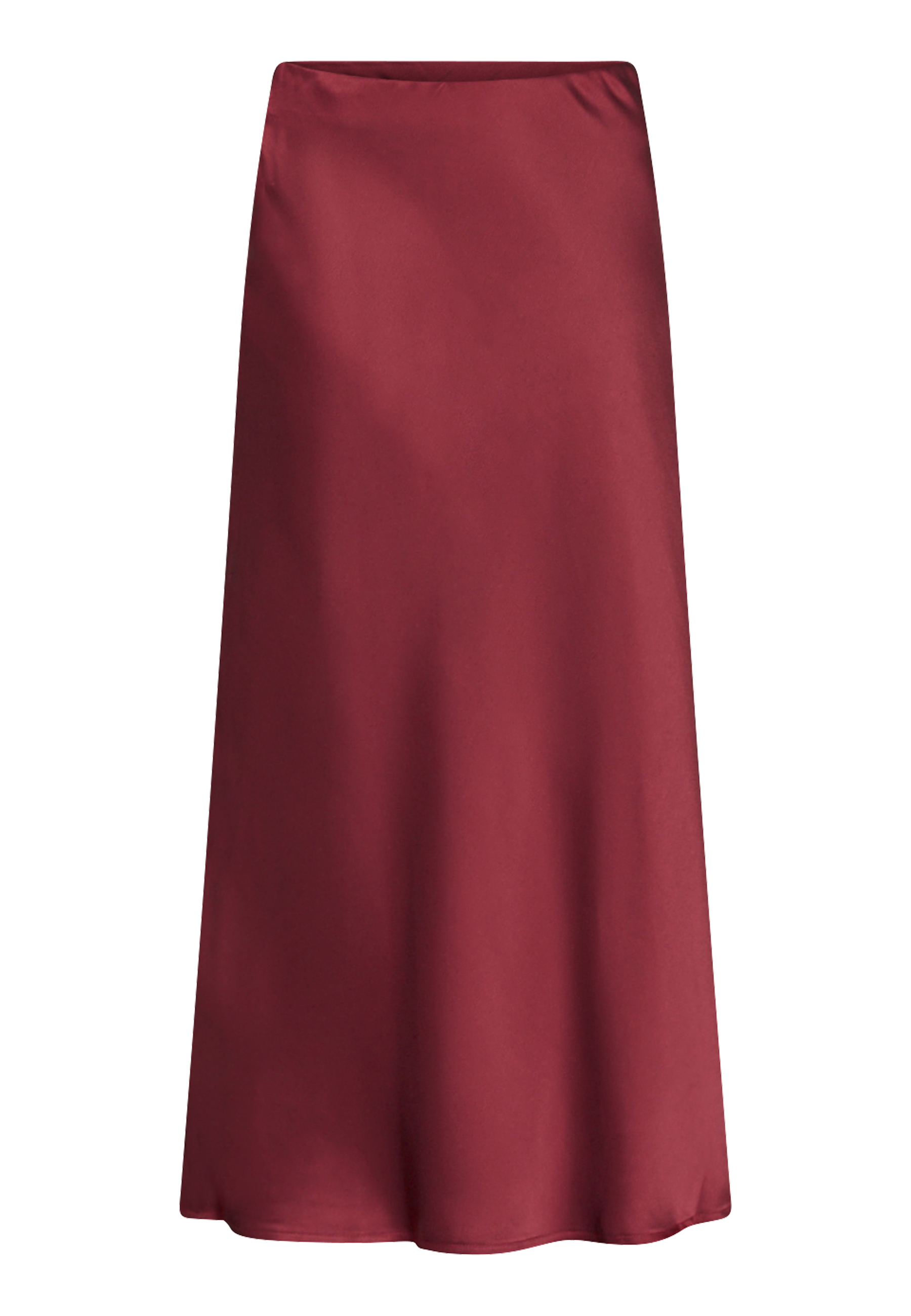 De Rok Gewo van Sisters Point is een lange, elegante rok van satijn in een diepe bordeauxkleur. De elastische tailleband zorgt voor een comfortabele pasvorm, terwijl de losse onderkant een vloeiende, stijlvolle uitstraling geeft. Perfect te combineren met een blouse of top voor een chique en vrouwelijke look.
