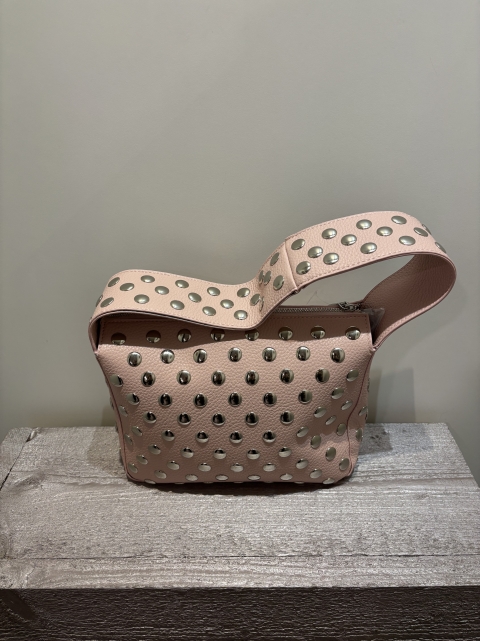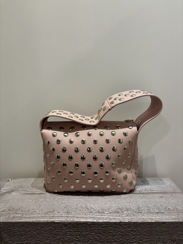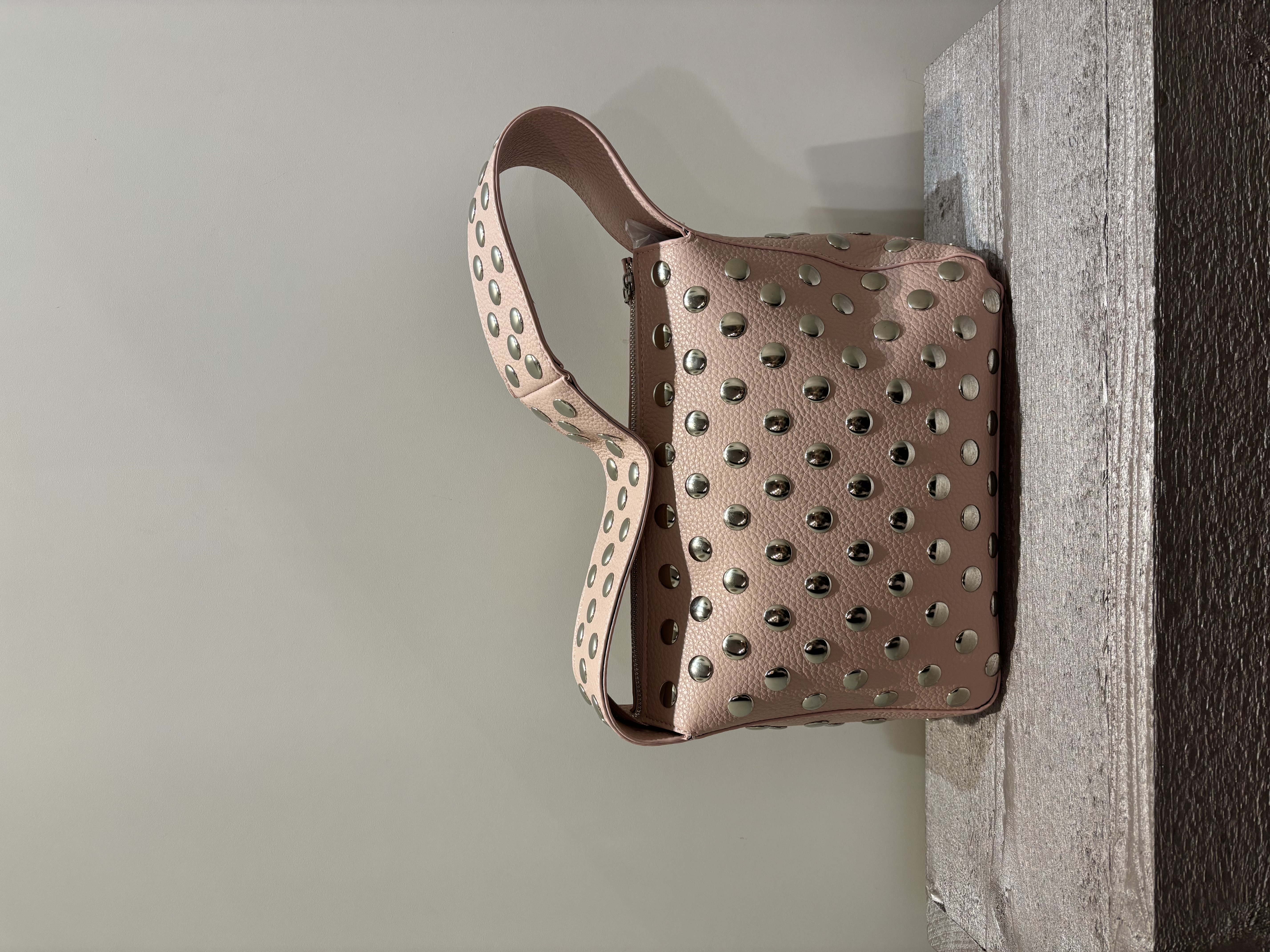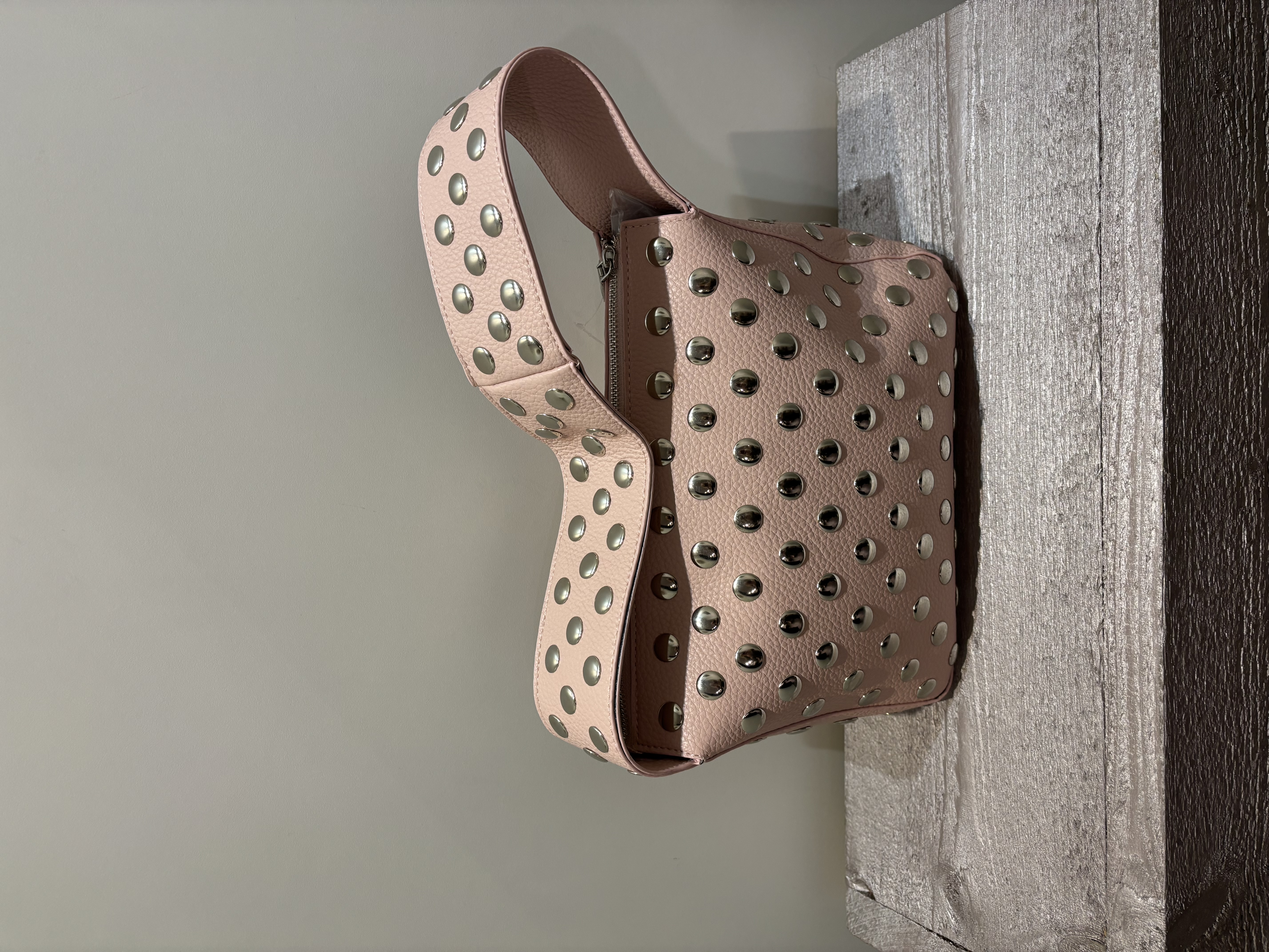 Oudroze leren hand-/schoudertas van Michelle met stoere studs en een compacte, stijlvolle vorm. De tas heeft zowel korte hengsels als een lange, verstelbare schouderband, zodat je haar op meerdere manieren kunt dragen. Binnenin zitten twee praktische vakken – één met rits en één open – en de tas sluit veilig met een ritssluiting. Zilverkleurige details zorgen voor een moderne, frisse look.