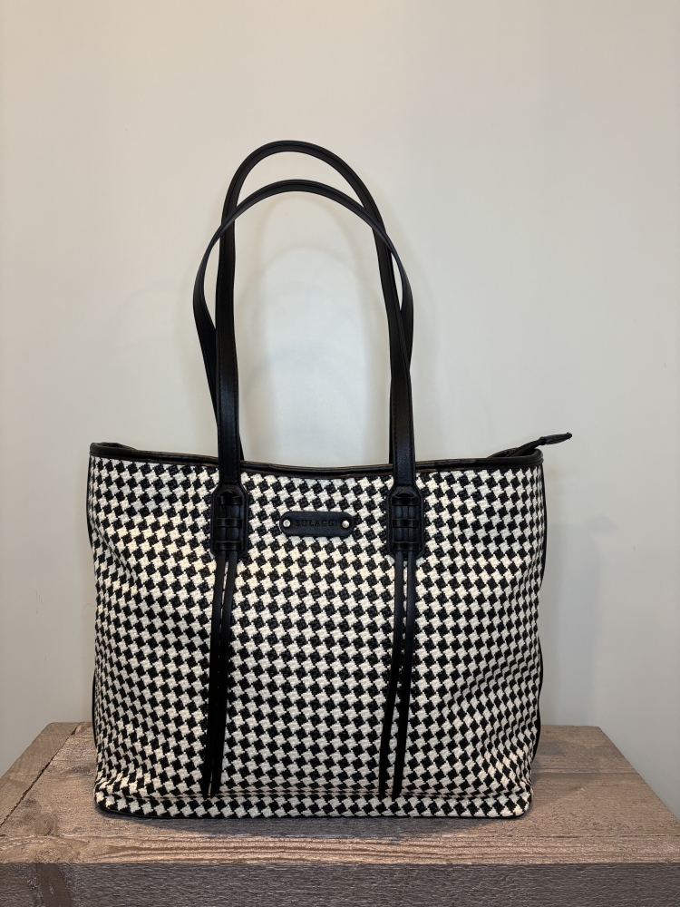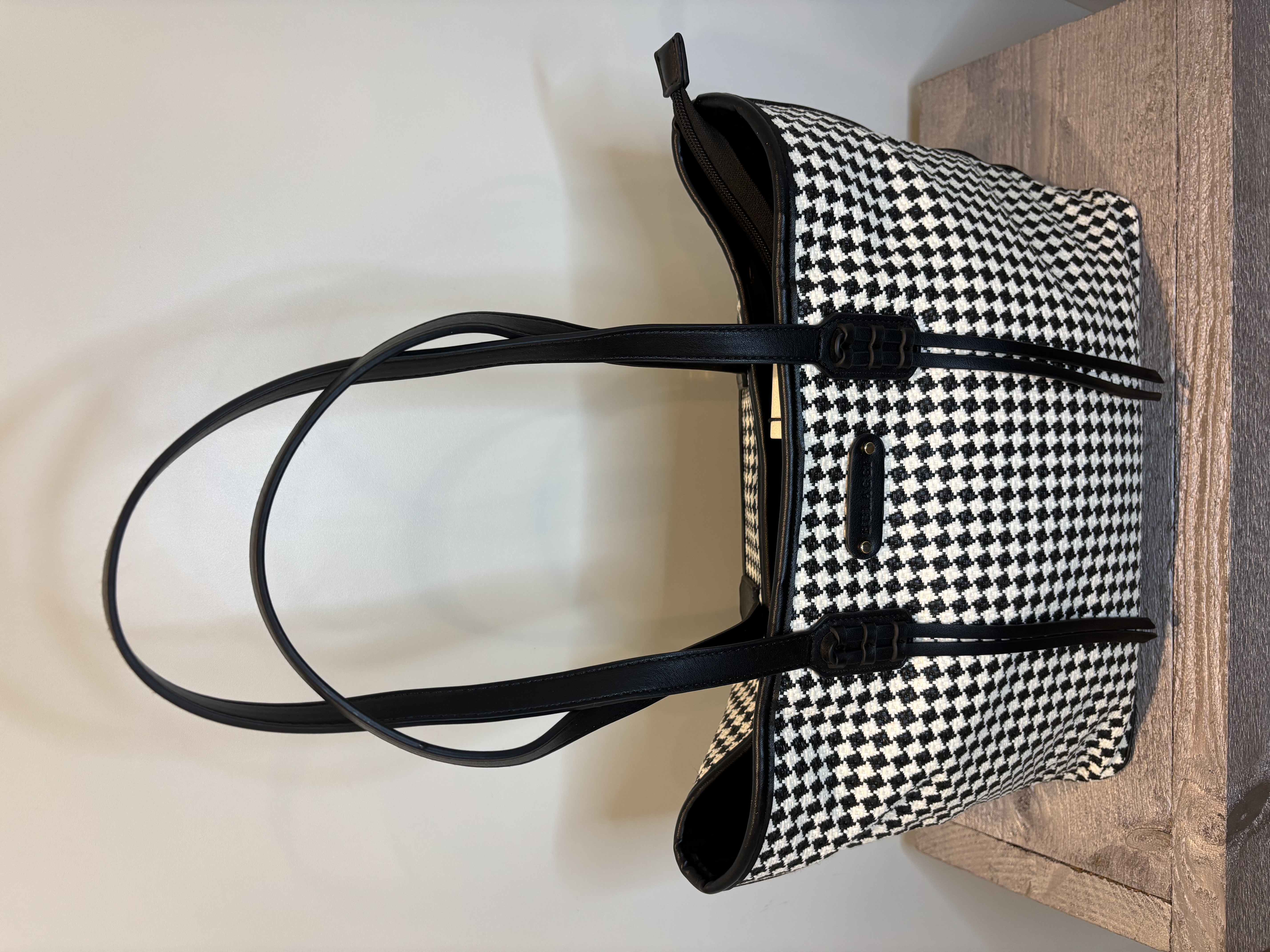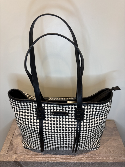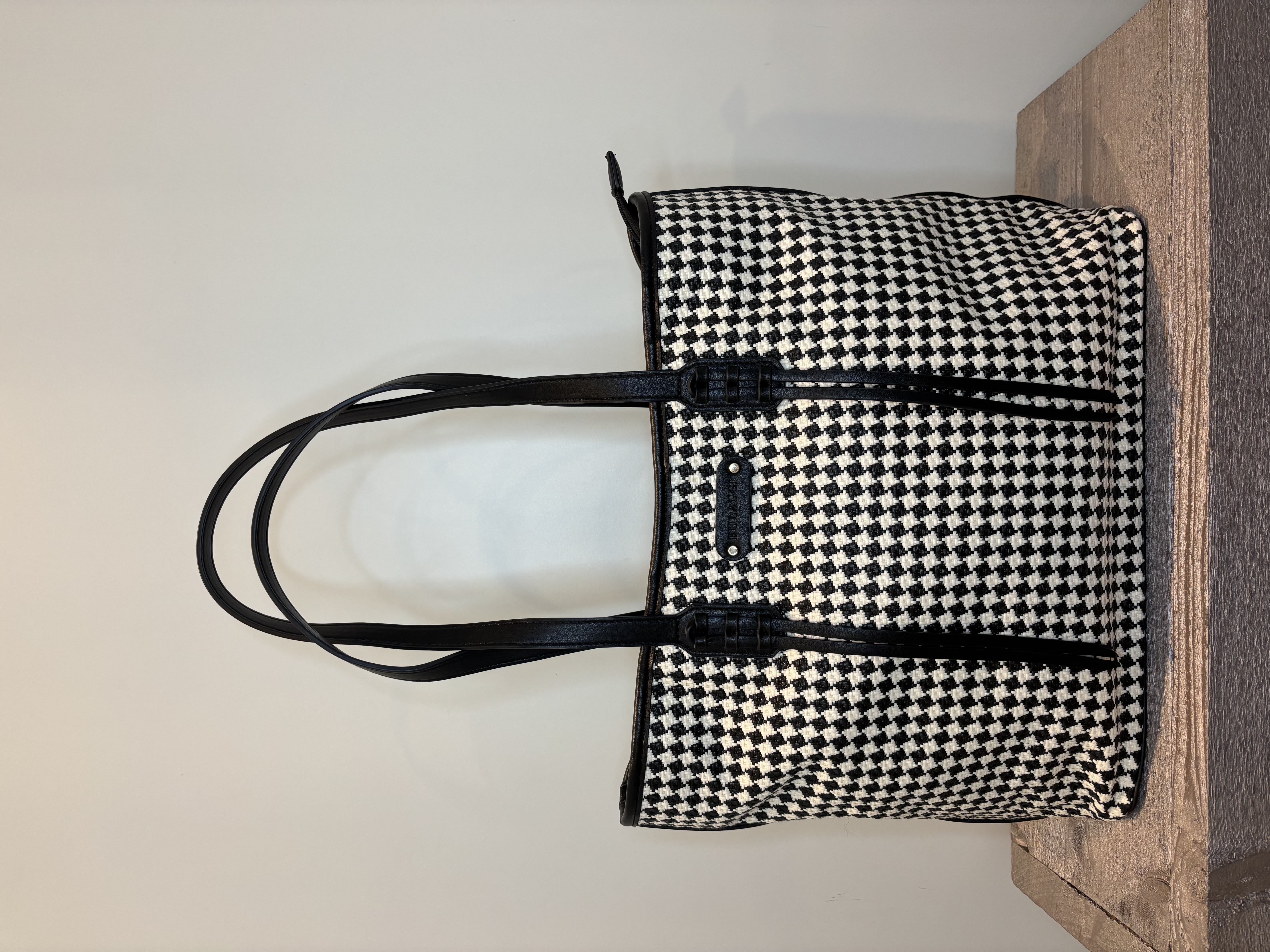 Zwart/witte Bulaggi handtas met pied-de-poule dessin, uitgevoerd in vegan leer gecombineerd met stof voor een stijlvolle, eigentijdse look. De tas heeft lange schouderhengsels én een lange, verstelbare schouderband, zodat je haar zowel over de schouder als crossbody kunt dragen. Binnenin zitten twee praktische vakken – één met rits en één open – en de tas sluit veilig met een rits, terwijl de goudkleurige details zorgen voor een chique afwerking.