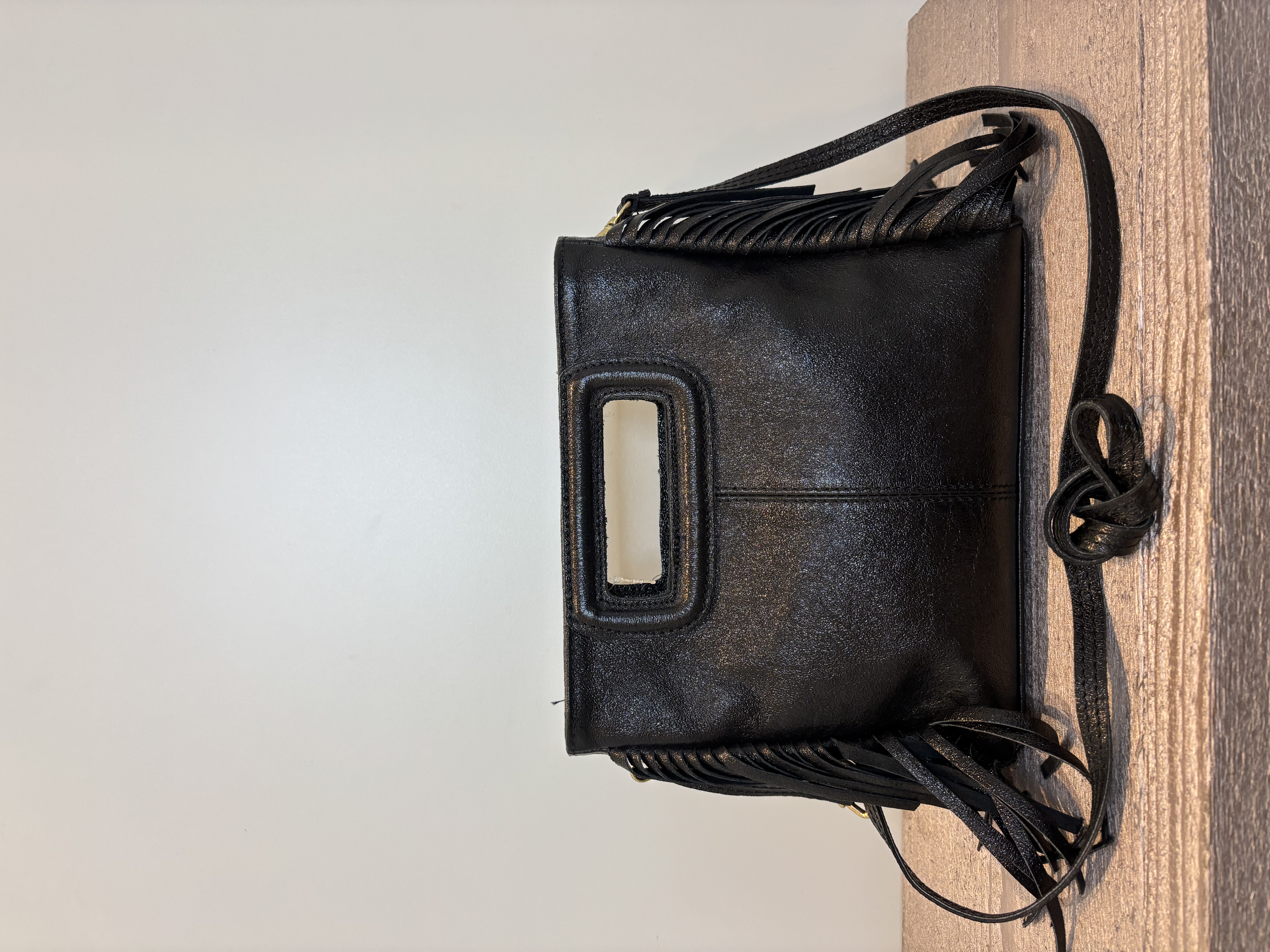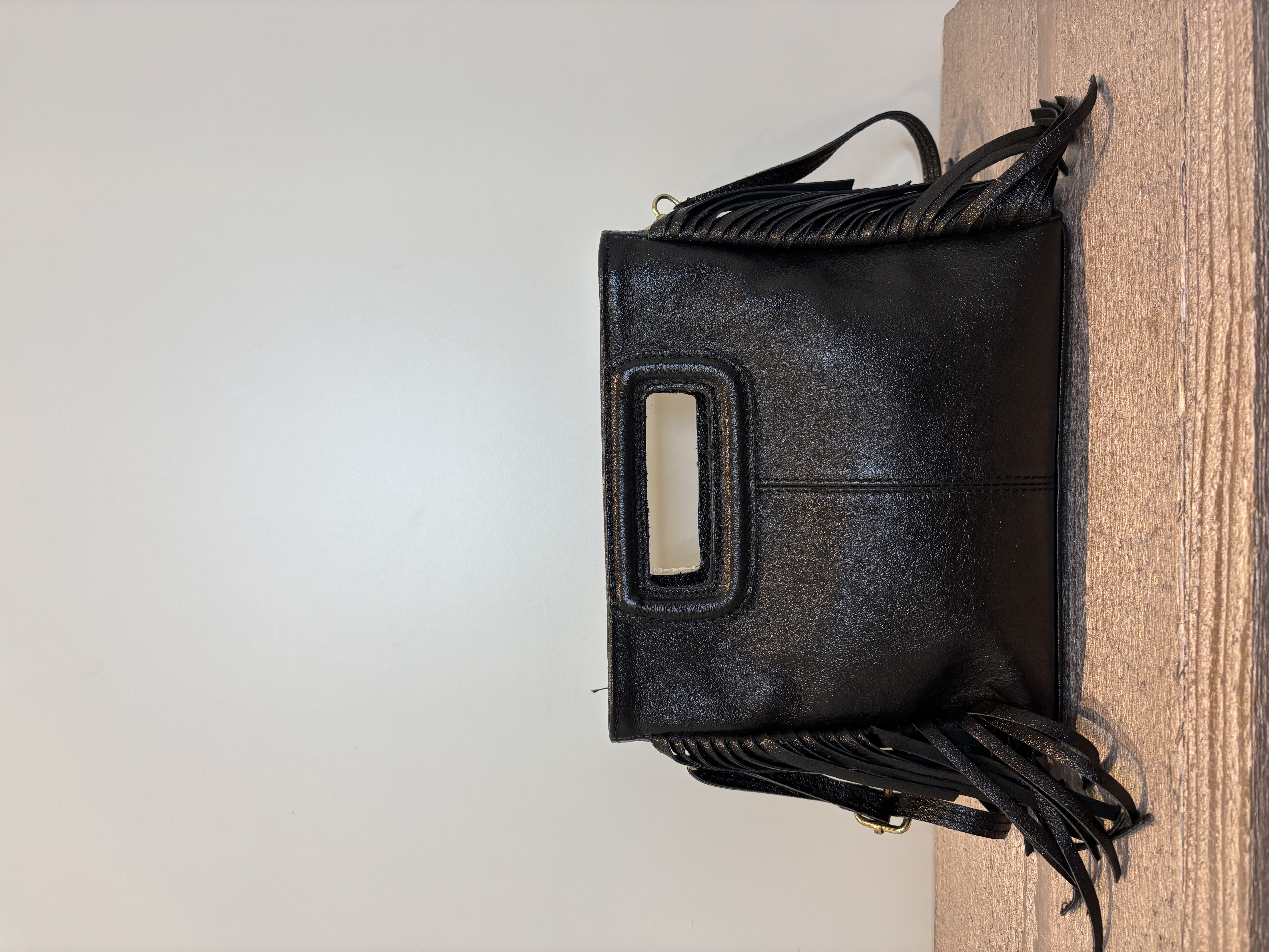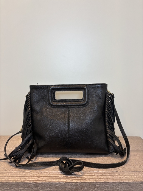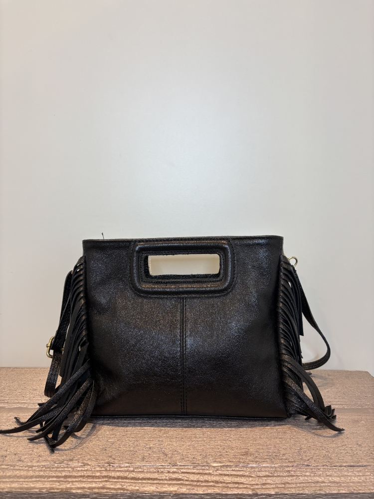 Zwarte leren handtas met subtiel glittereffect en speelse franjes voor een feestelijke, vrouwelijke look. De tas heeft een stevige top-handle en een lange verstelbare schouderband, zodat je haar zowel in de hand als crossbody kunt dragen. Ze sluit met een knoopsluiting en binnenin zit een handig binnenvak met ritssluiting voor je belangrijkste spullen.