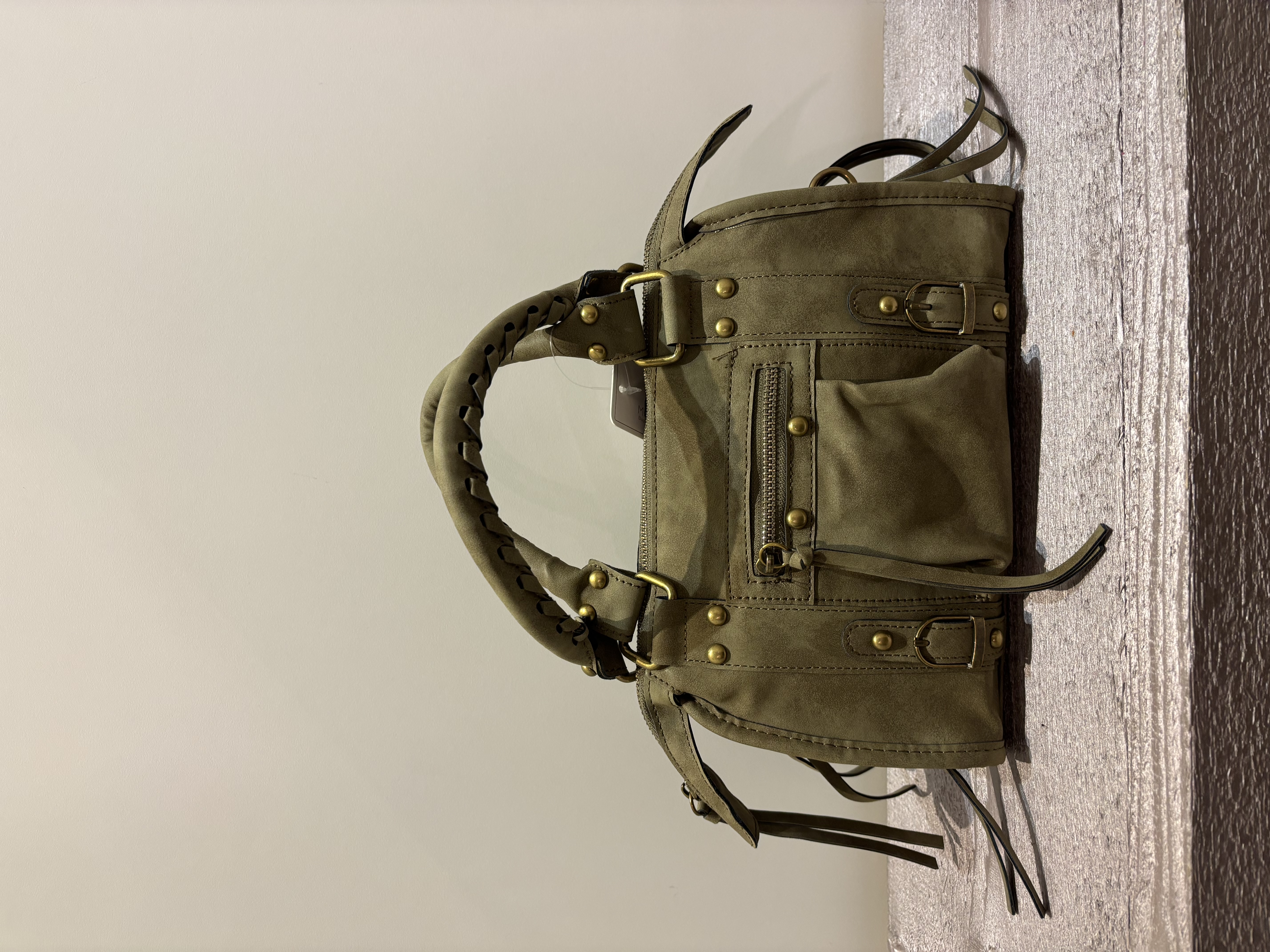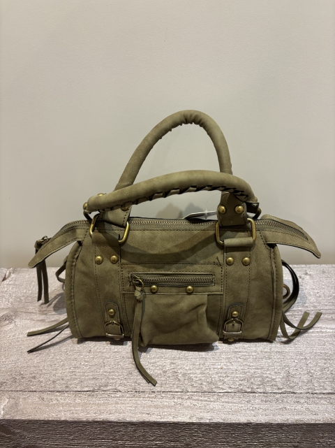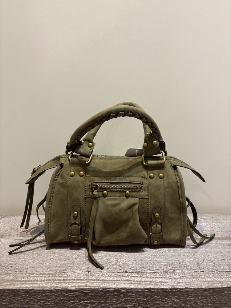 Olijfgroene leren handtas van Michelle met een compacte, stijlvolle vorm en goudkleurige details. De tas sluit met een ritssluiting en heeft binnenin twee praktische vakken – één met rits en één open – plus een extra zijvak met rits, zodat je je essentials makkelijk georganiseerd houdt.