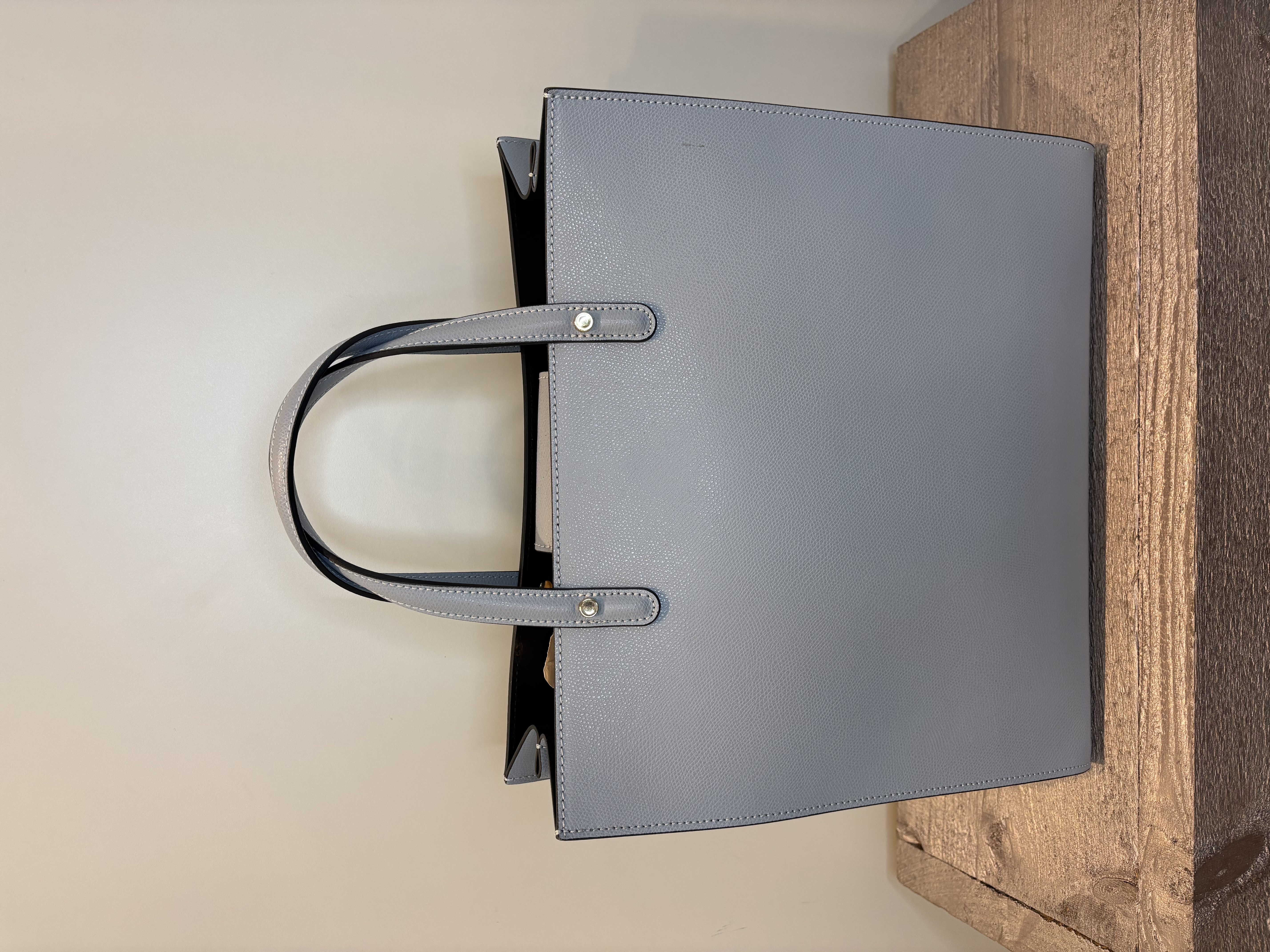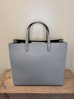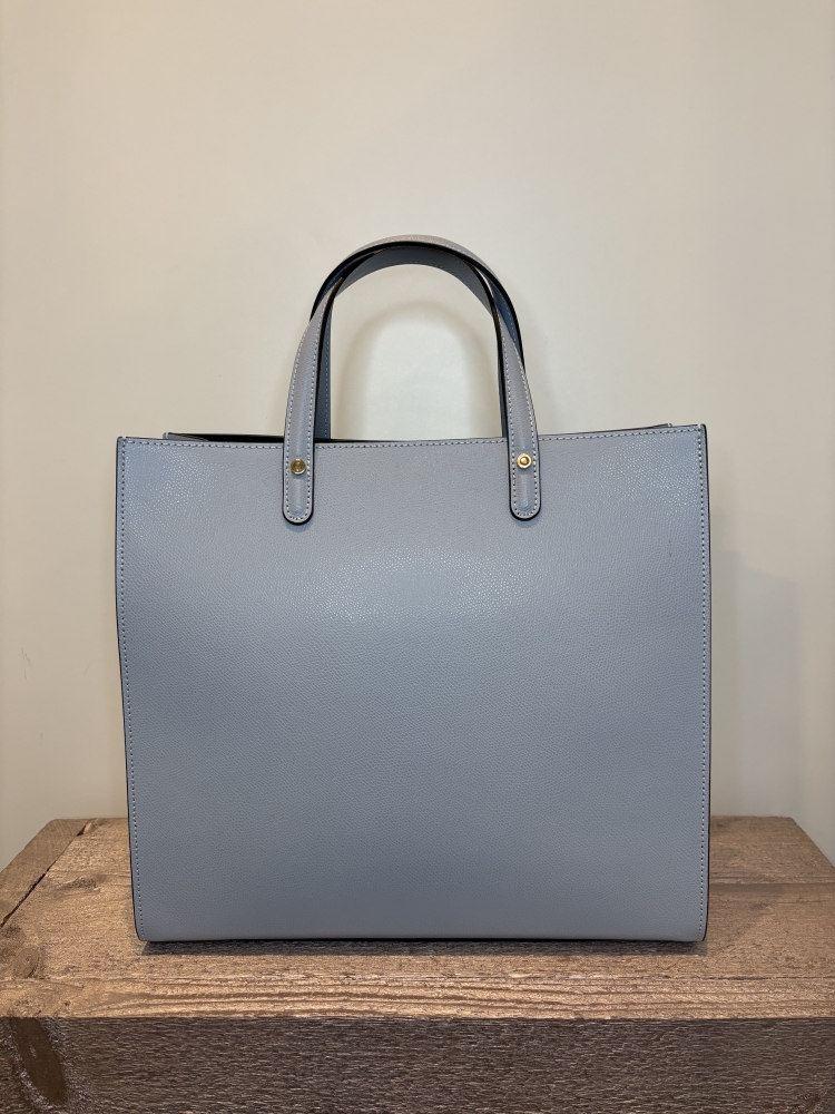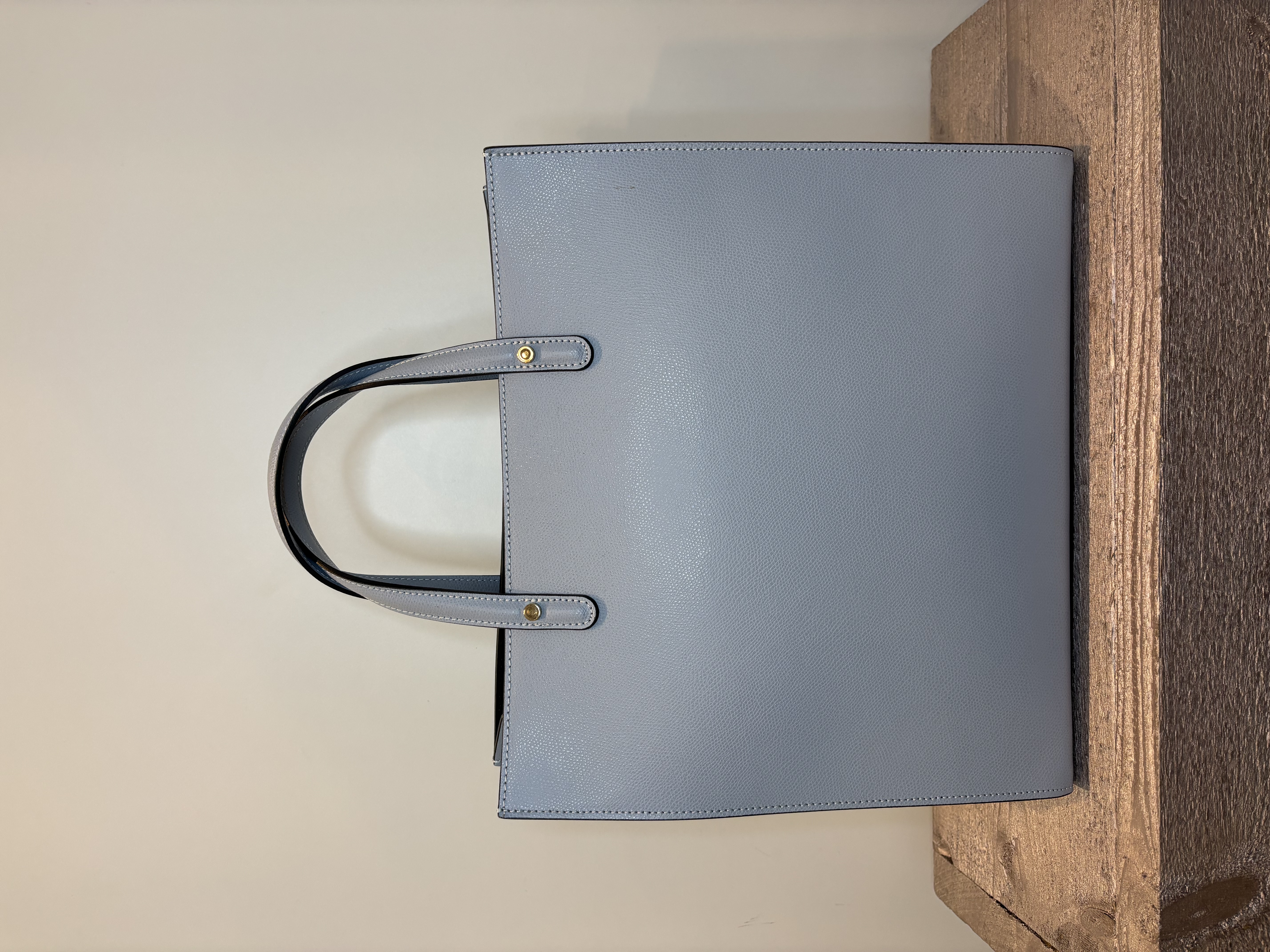 Lichtblauwe leren handtas met een strakke, moderne vorm en goudkleurige details. De tas heeft stevige handvatten en een lange verstelbare schouderband, zodat je haar zowel in de hand als over de schouder kunt dragen. Ze sluit met een knoopsluiting en is ingedeeld in twee vakken, met in het midden een groot binnenvak met ritssluiting voor je waardevolle spullen.