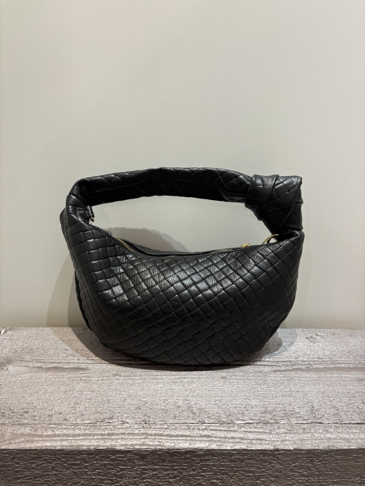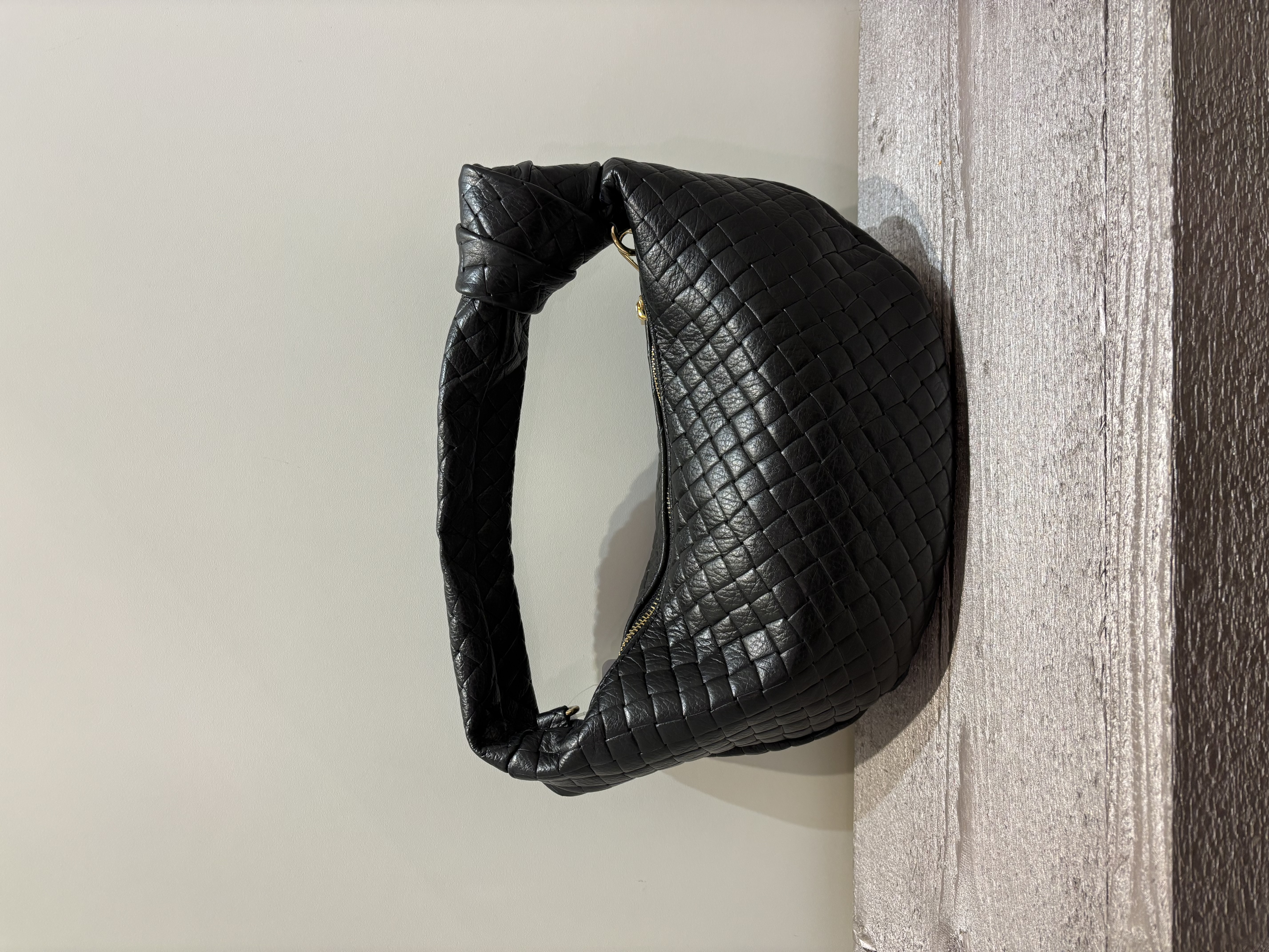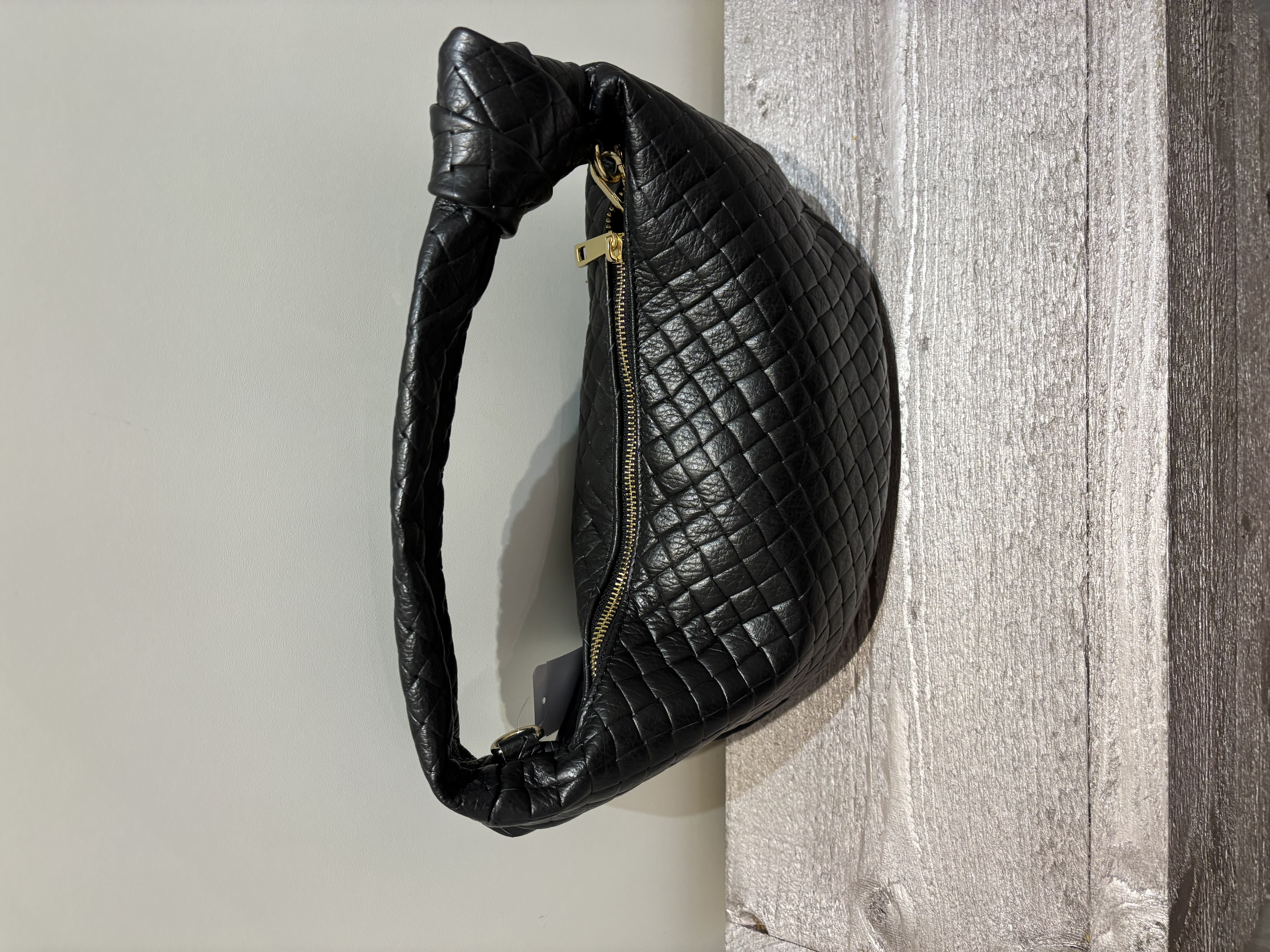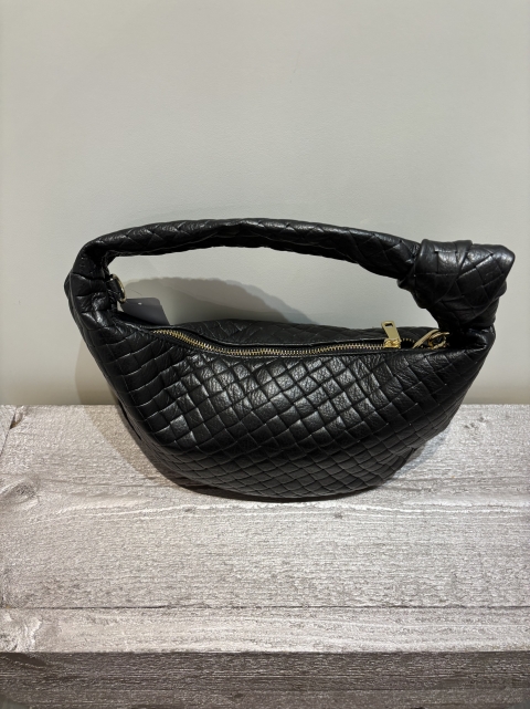 Zwarte leren handtas met een trendy gewatteerde, gevlochten look. De tas heeft een brede, comfortabele schouderband en wordt geleverd met een lange, verstelbare band zodat je haar ook crossbody kunt dragen. Binnenin zit een handig vak met ritssluiting voor je belangrijkste essentials. De tas sluit met een rits en is afgewerkt met goudkleurige details voor een chique touch.
