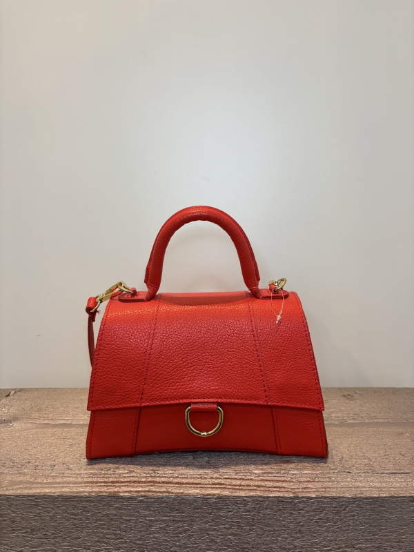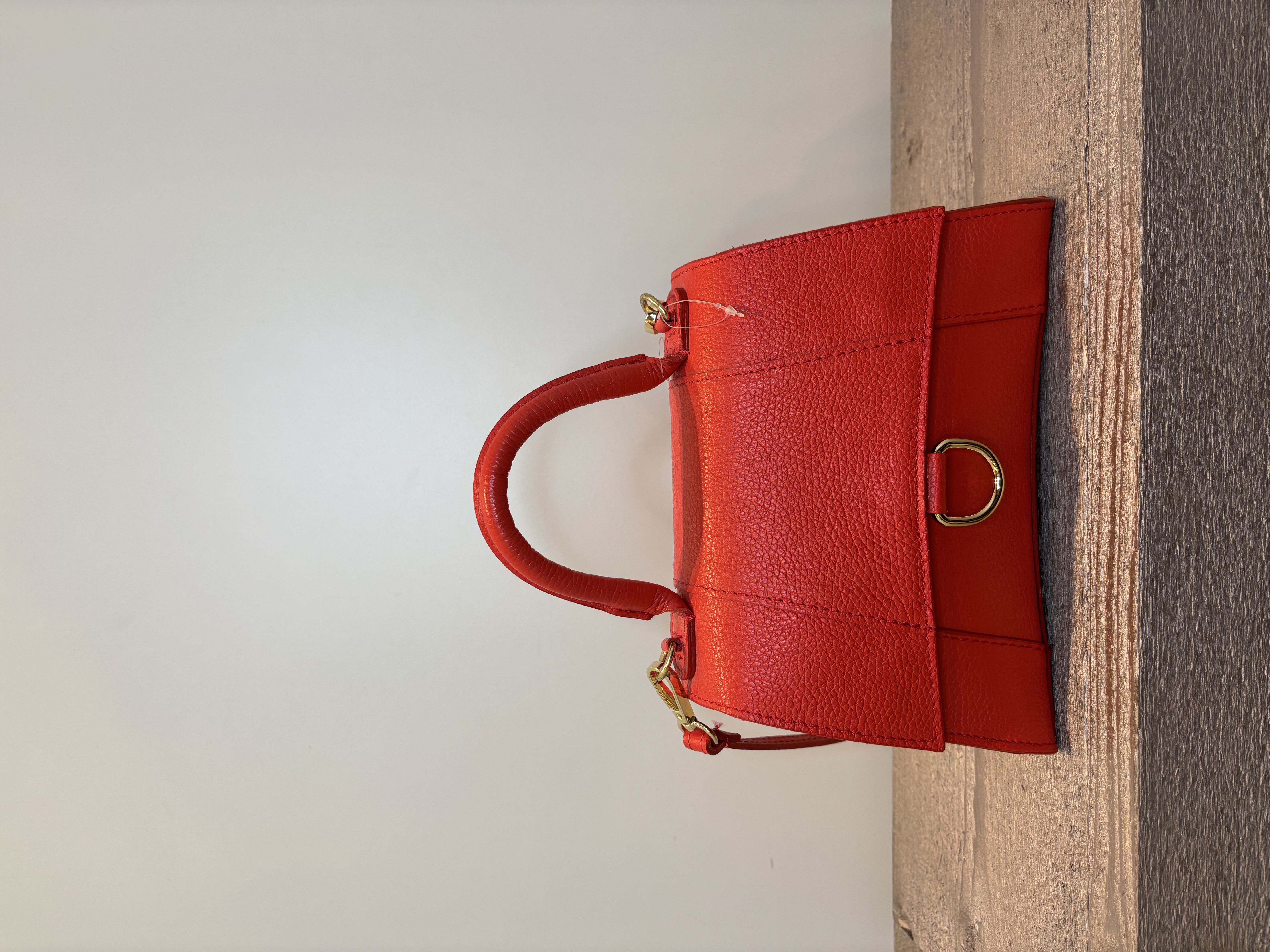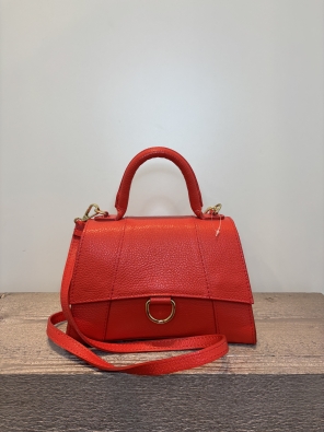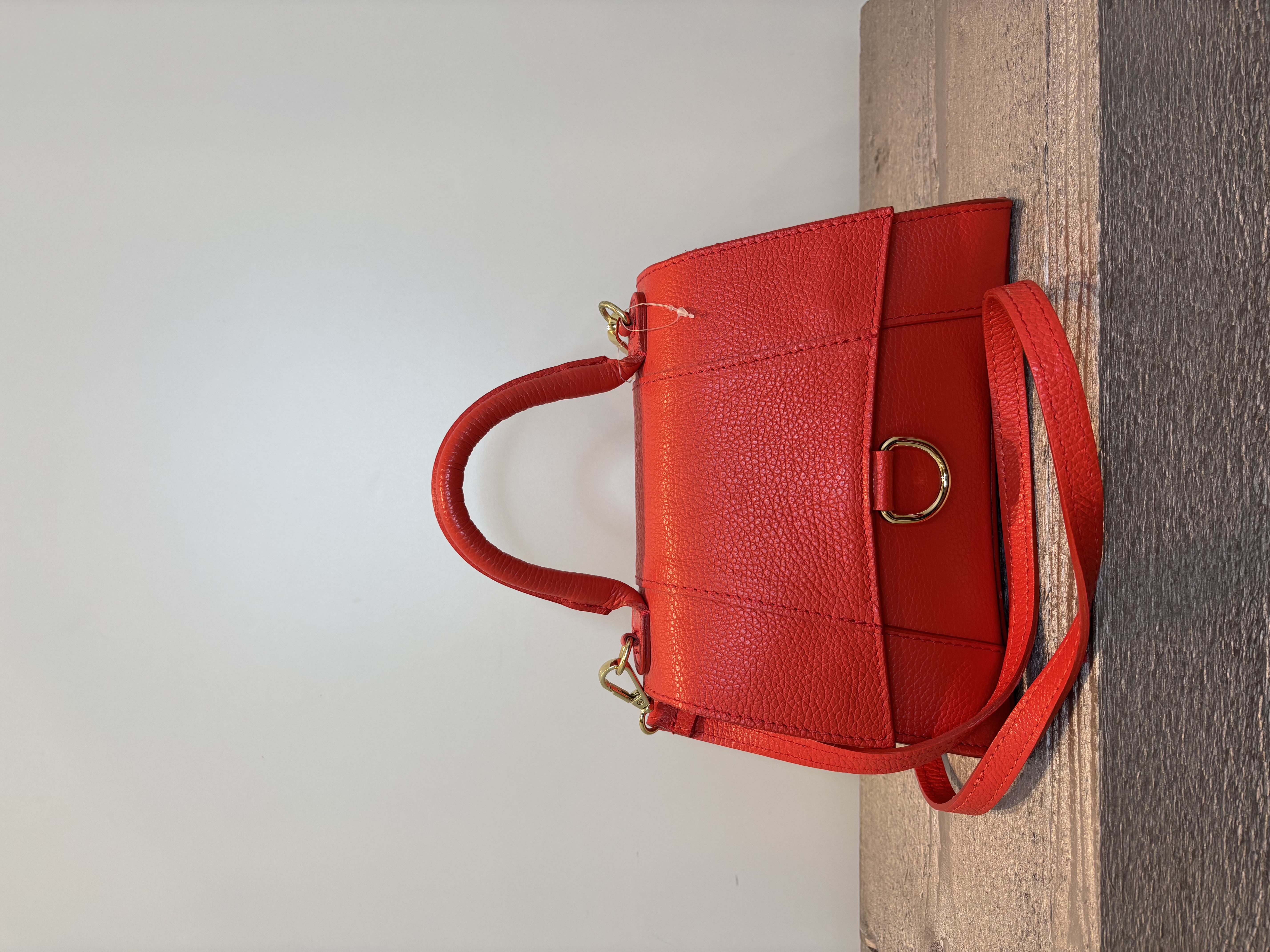 Koraal rode leren handtas met een stijlvolle, compacte vorm en goudkleurige details. De tas heeft een stevige top-handle én een lange verstelbare schouderband, zodat je haar zowel in de hand als crossbody kunt dragen. Ze sluit met een knoopsluiting en binnenin zit een handig binnenvak met rits voor je belangrijkste spullen.