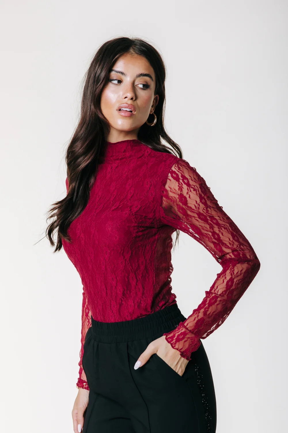 Zoek je een nauwaansluitende kanten top? De Noe Lace Top van Colourful Rebel is jouw ideale keuze voor een elegante en sensuele look. Deze fitted top met lange mouwen in de kleur Bordeaux is voorzien van stretch voor optimaal comfort en een perfecte pasvorm. Ideaal als basis voor een avondoutfit of om onder een blazer of trui te dragen voor een gelaagde look.
