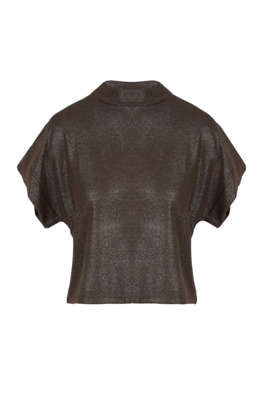 De Top Lucie van Elvira is een glanzende, cropped top met een opstaande kraag. De top heeft korte, losvallende mouwen en is uitgevoerd in een warme, goudbruine kleur met een subtiele glinstering.