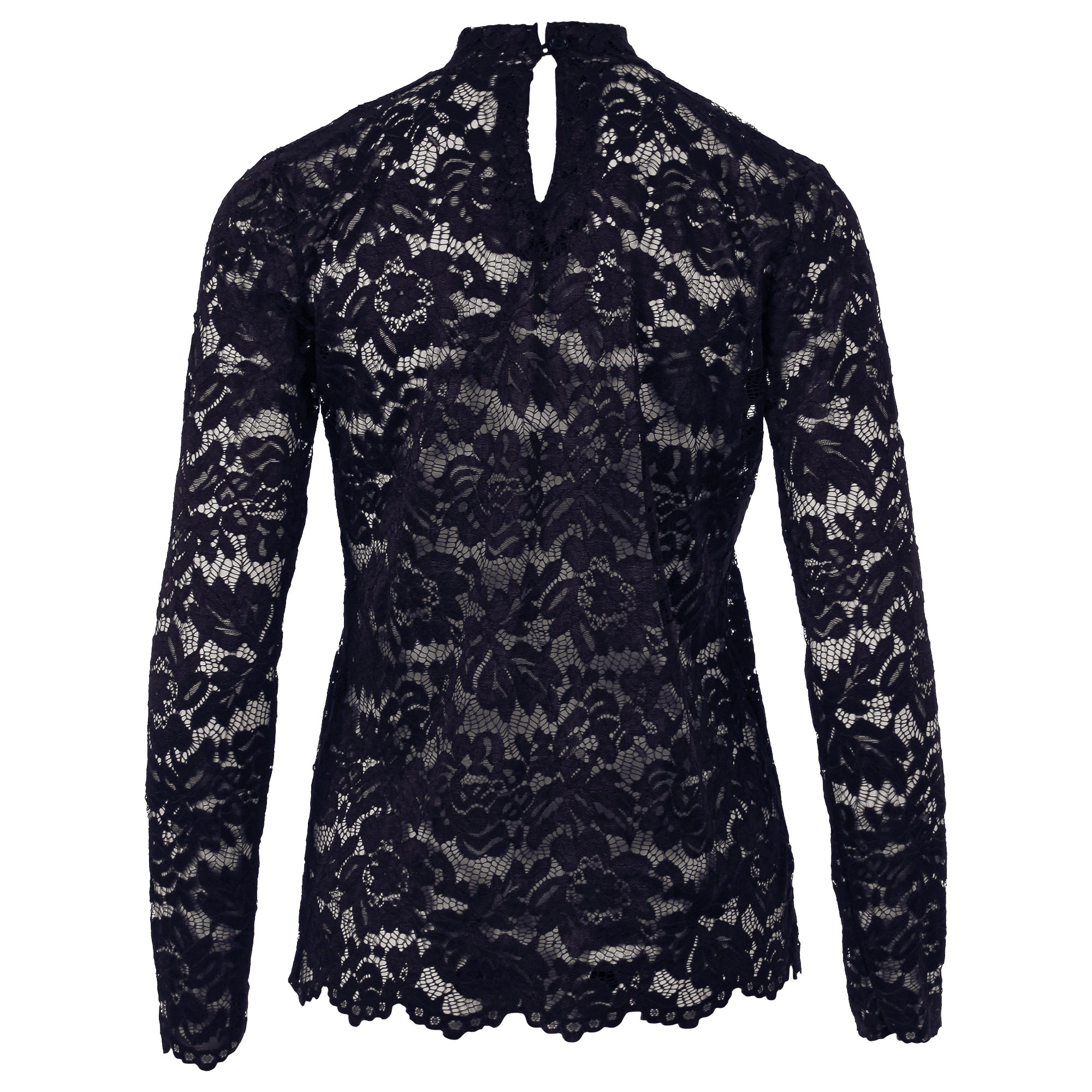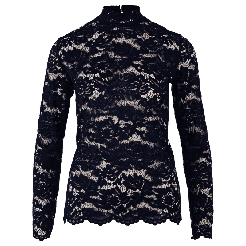 Kanten top van Enjoy met een elegante, vrouwelijke uitstraling. De top heeft lange mouwen, een opstaande kraag en een verfijnde keyhole met knoopsluiting aan de achterzijde. Perfect om zowel chic als casual te combineren.