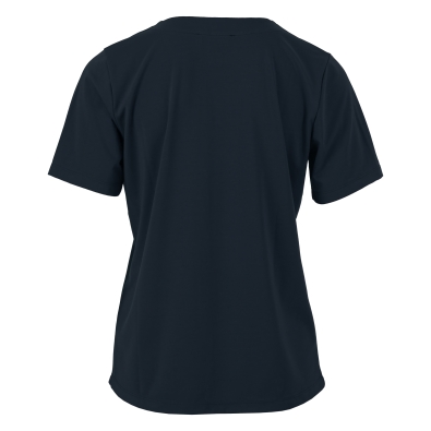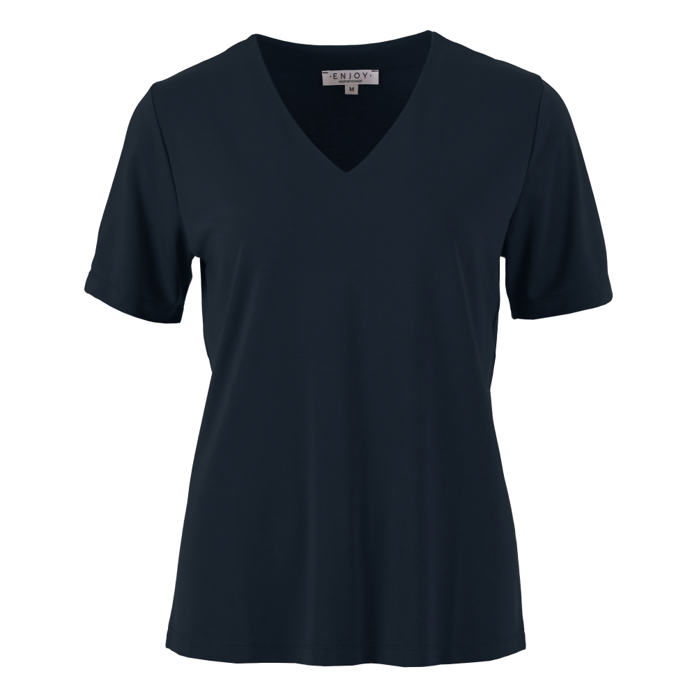 Indigoblauw T-shirt van Enjoy met een vrouwelijke V-hals en korte mouwen. Het shirt is gemaakt van een soepele, zachte kwaliteit met stretch, waardoor het comfortabel draagt en mooi langs het lichaam valt. Perfect als basisitem voor zowel casual als geklede looks.