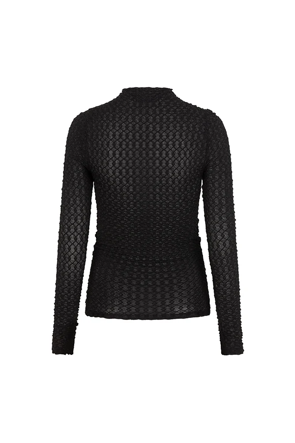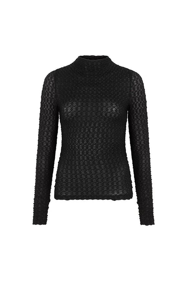 Zoek je een comfortabele zwarte top met opstaande kraag? De Top Leona van Lofty Manner is een aansluitende top met een elegante, subtiele structuur in de stof. De top heeft een hoge stretch en een opstaande kraag, waardoor hij perfect is voor zowel een geklede als een casual look.
