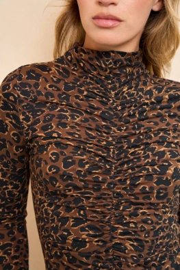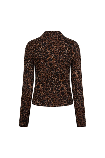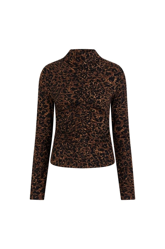 De Top Margaret is een bruine, aansluitende top met een trendy panterprint. De top is gemaakt van een zachte, comfortabele stof met veel stretch. De top heeft een opstaande kraag en is voorzien van een elegant geplooid effect bij de borst.