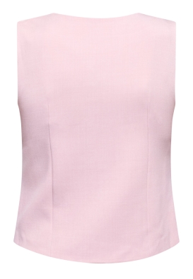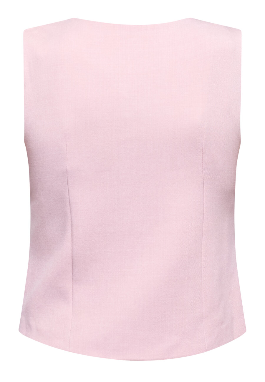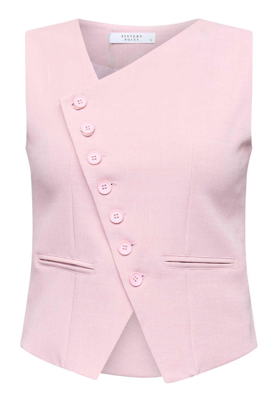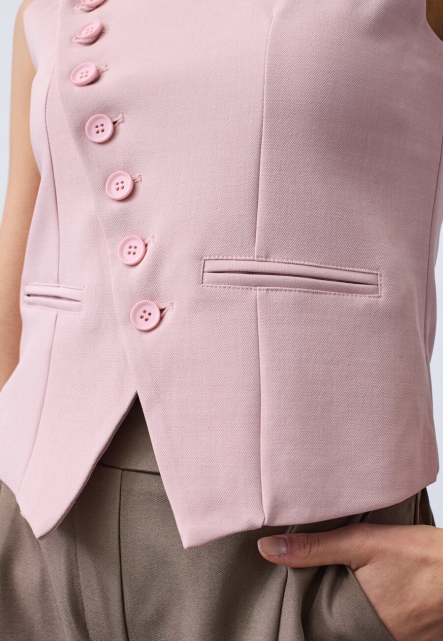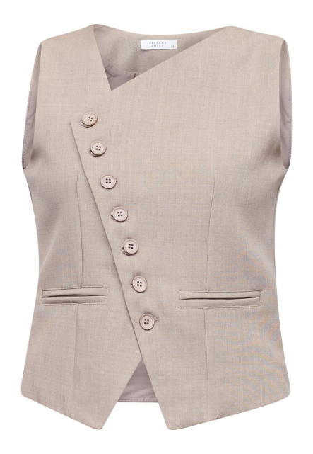 Gata is een mouwloos vest met een asymmetrische halslijn voor een moderne, stijlvolle uitstraling. Het vest is afgewerkt met decoratieve knopen aan de voorkant en heeft een getailleerde pasvorm die zorgt voor een elegante en verfijnde look. Mooi te dragen als statement item of in combinatie met een bijpassende broek of blazer.